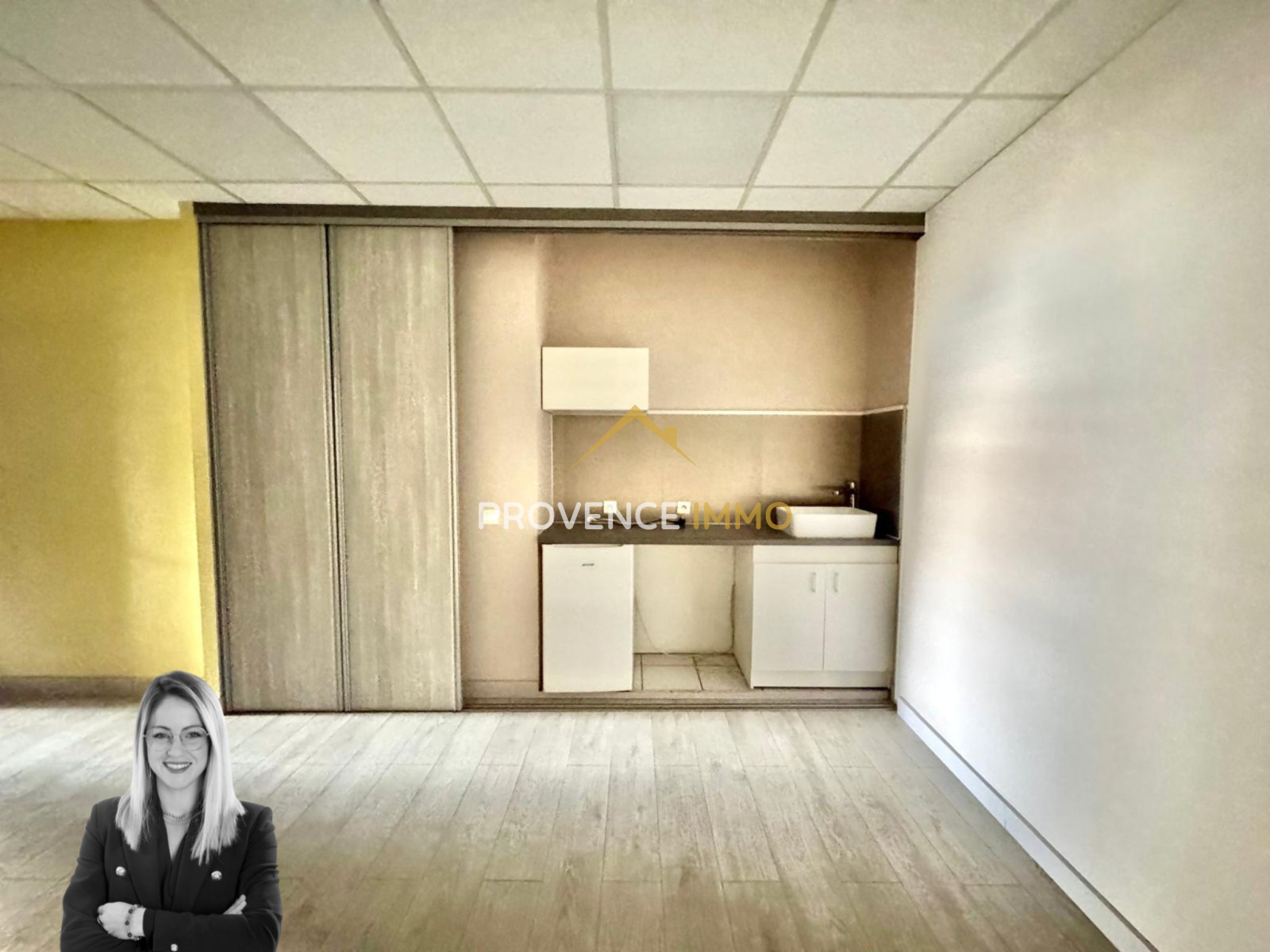 Une grande pièce de 19 m² avec kitchenette intégrée dans un placard (exposition nord, aveugle)
