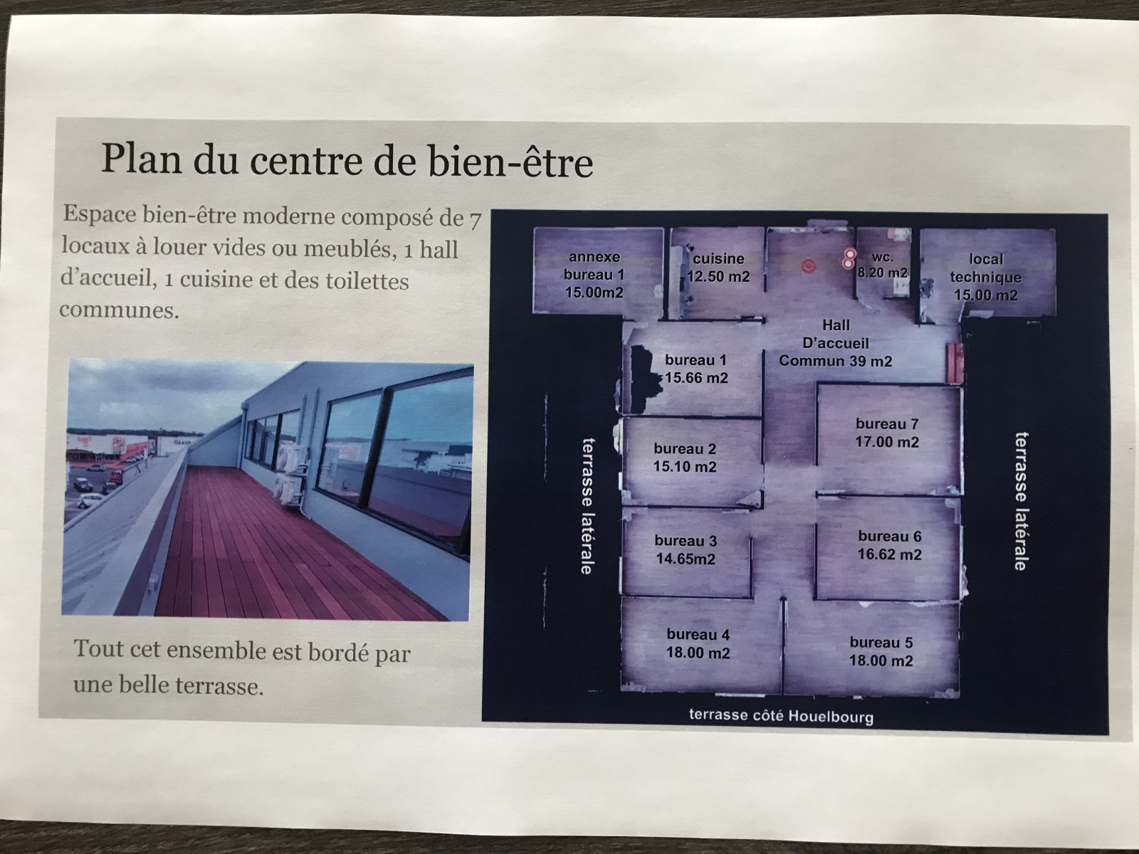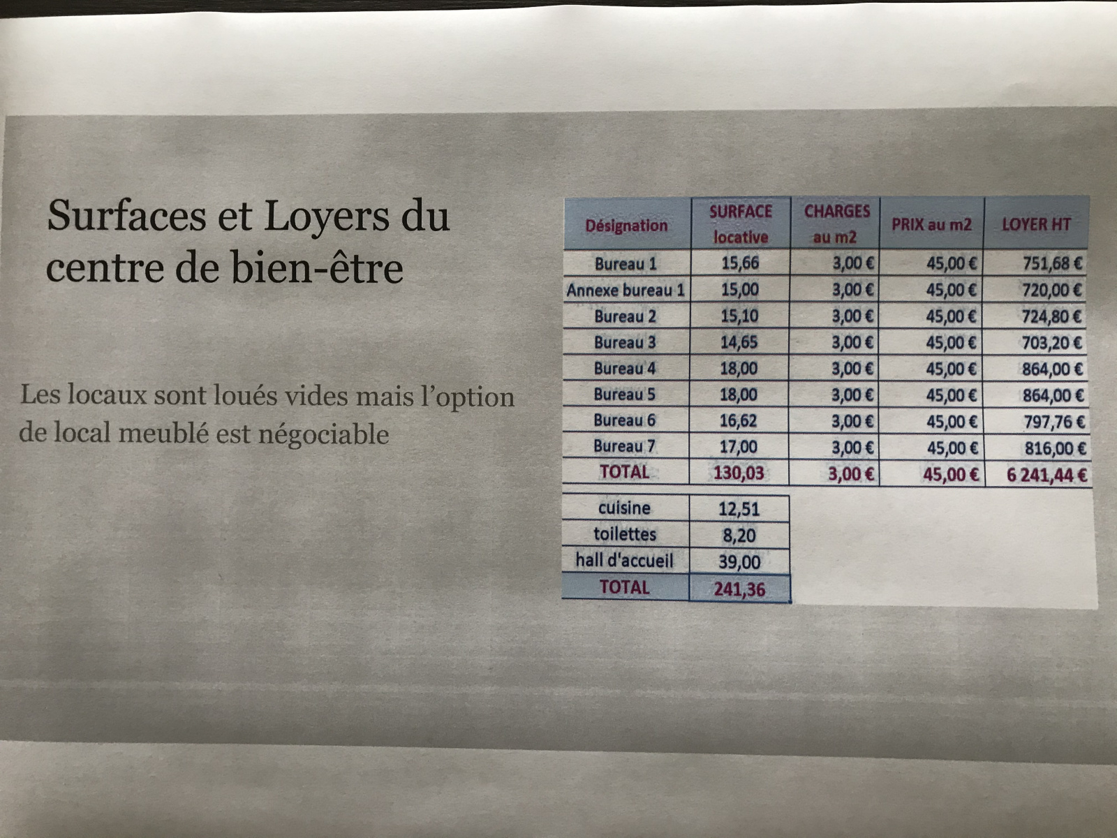 Espace bien etre moderne composé de 7 locaux à louer. A dispposition 1 hall d accuiel, 1 cuisine, toilette. Cet espace est destiné aux aux professionels de la santé et du bien etre (Kiné, ostéo, medecins soins esthétiques)