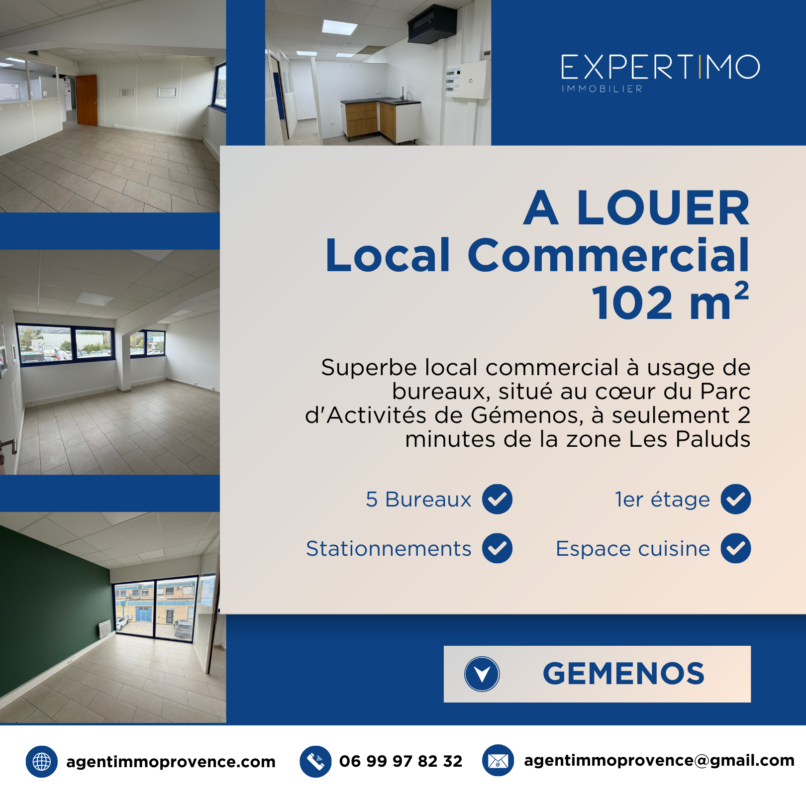Christophe GRIFFE, votre conseiller en immobilier EXPERTIMO, est à votre disposition au 06 99 97 82 32 pour vous proposer un superbe local commercial à usage de bureaux de 102 m², idéalement situé au cœur du Parc d'Activité de Gémenos et à seulement 2 minutes de la ZI Les Paluds.