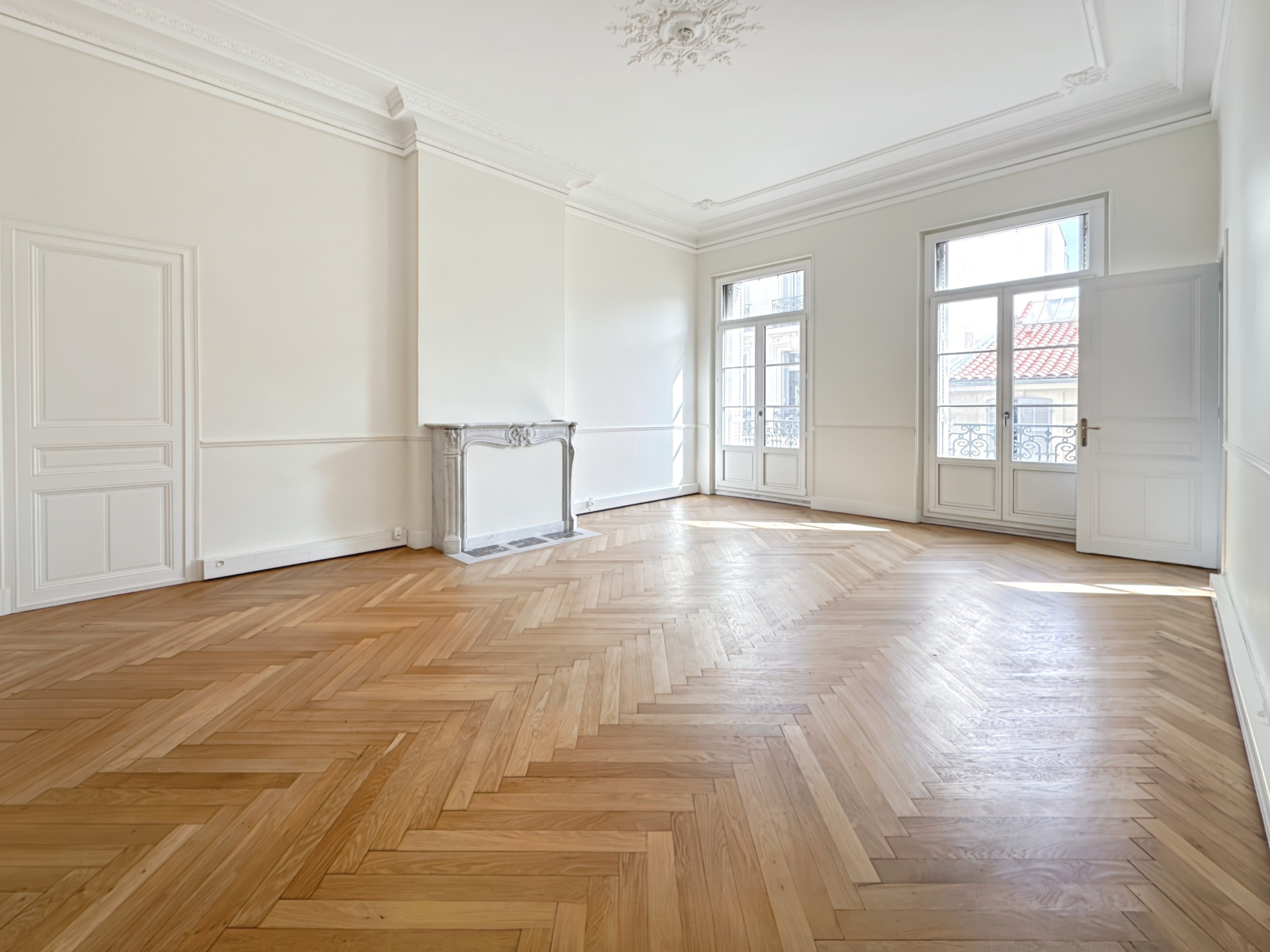Prestations : parquet chevron et Versaille en chêne, moulures aux plafonds, sous-bassement bois, cheminées marbre, clim réversible, huisseries bois double vitrage (moins de 3 ans), etc
