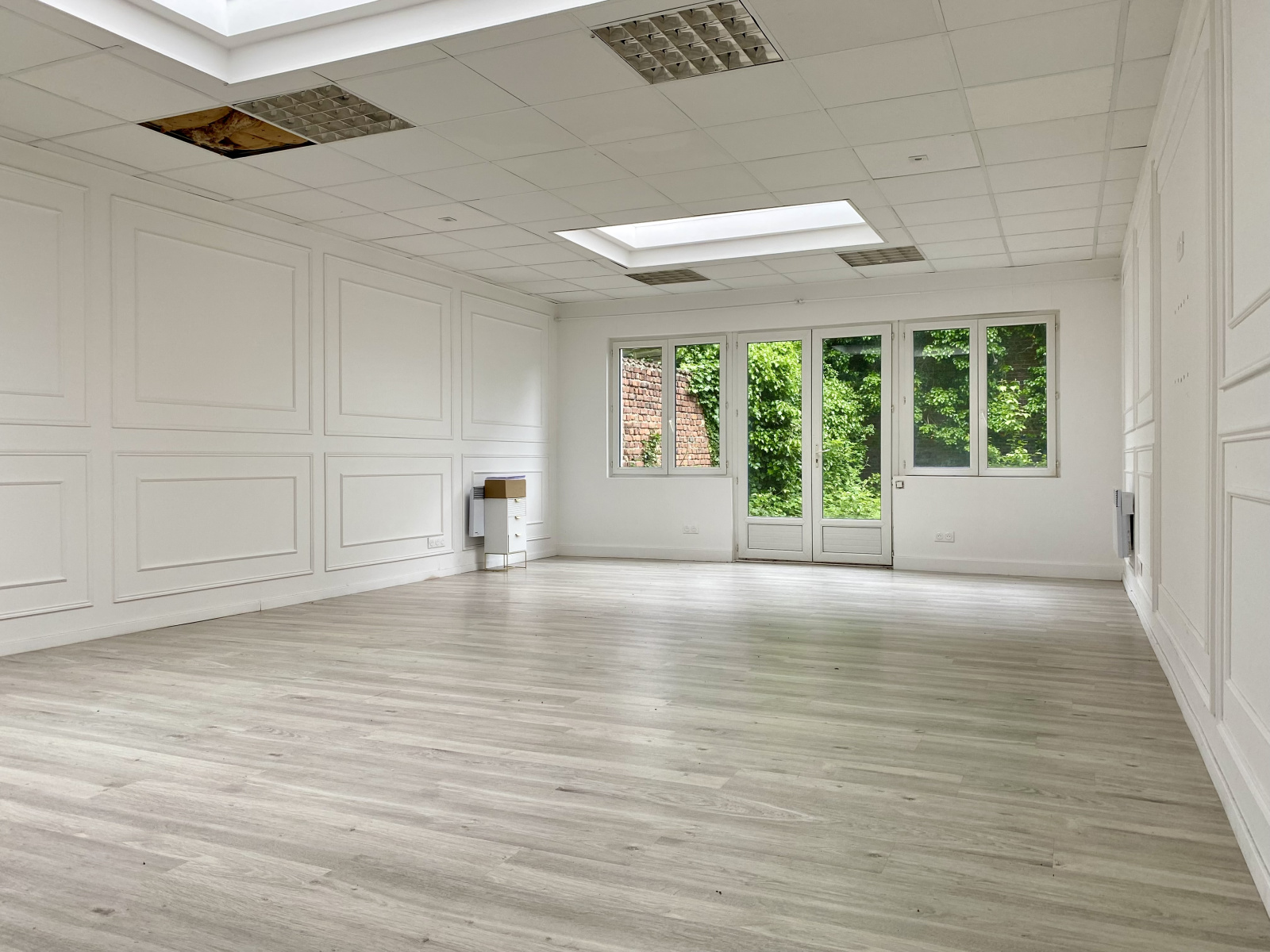 une entrée-accueil, un bureau de 14 m2 avec coin kitchenette, un open-space de 43 m2 avec accès sur une terrasse et un jardin, une cave au sous-sol.