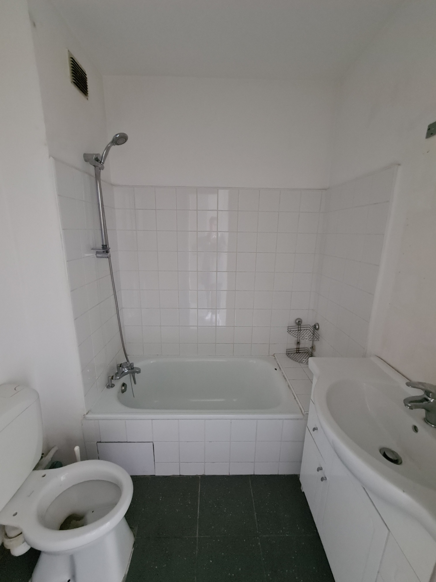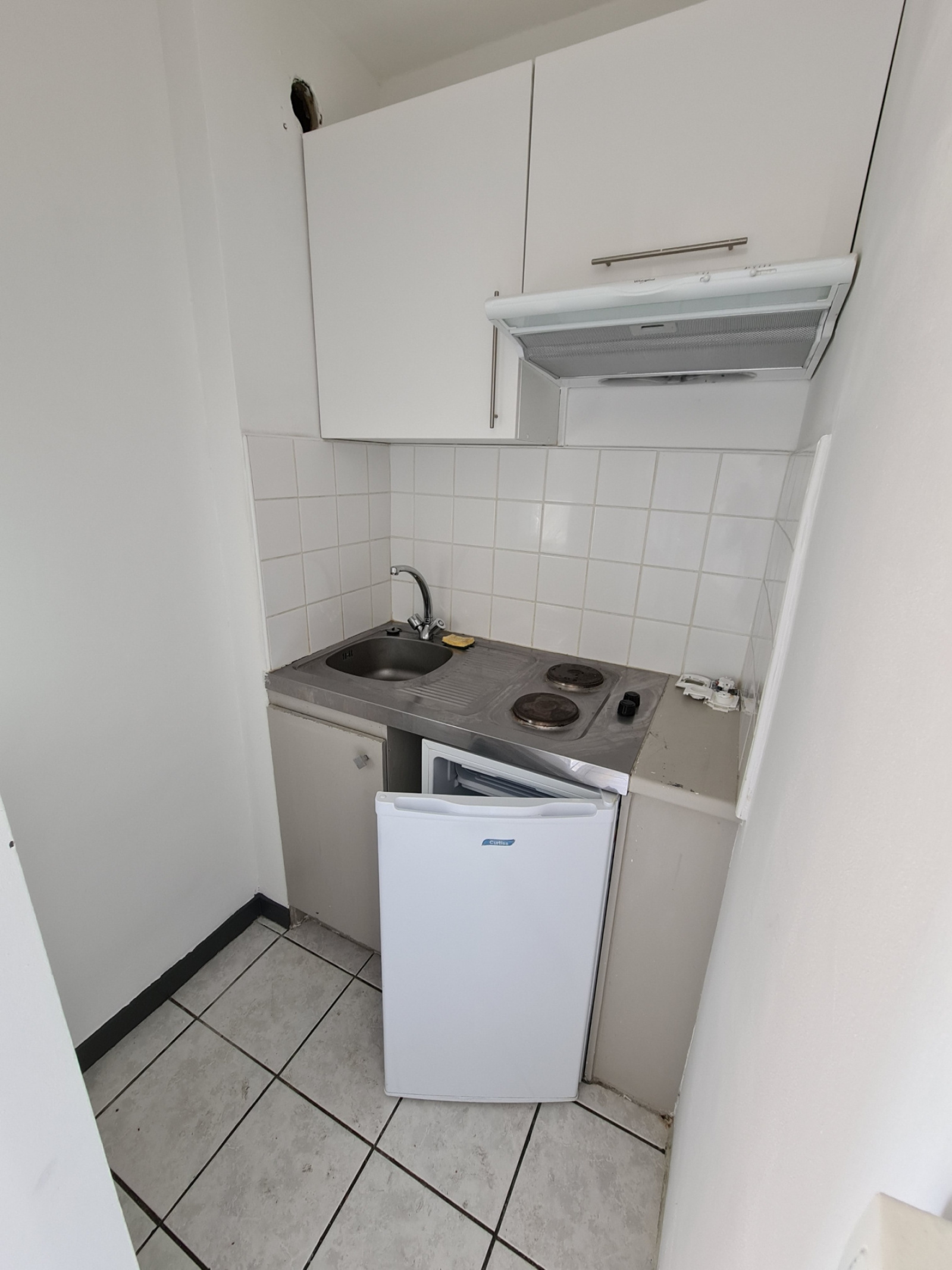 Le logement dispose d'une entrée avec placard, d'une pièce principale, d'un coin cuisine équipé, d'une salle de bain avec bagnoire et WC. L'appartement dispose également d'un balcon et d'une place de parking.