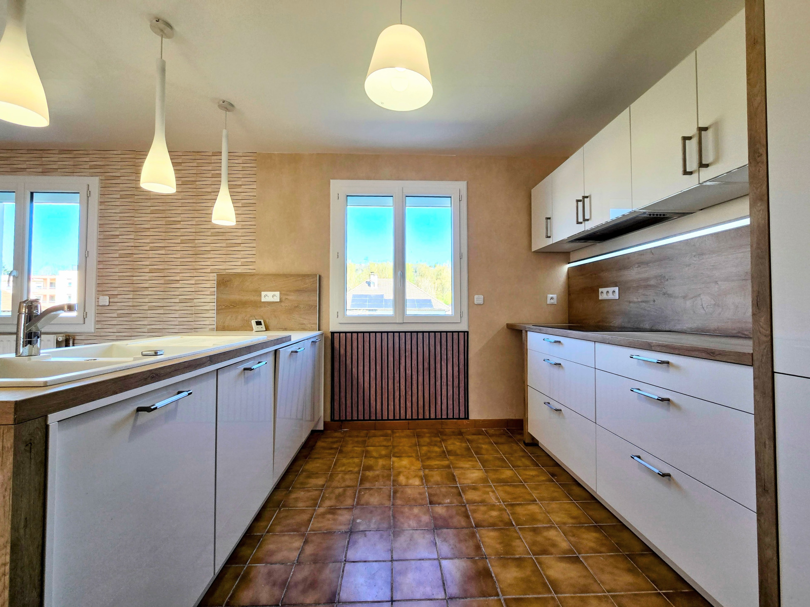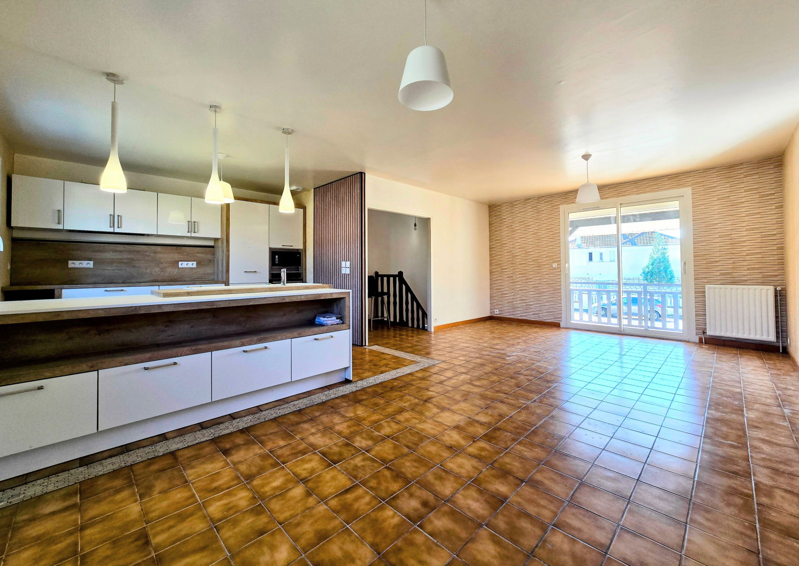 - étage: cuisine équipée, grande pièce salle à manger/ séjour donnant sur terrasse, un dégagement, 3 chambres, salle d'eau, wc,