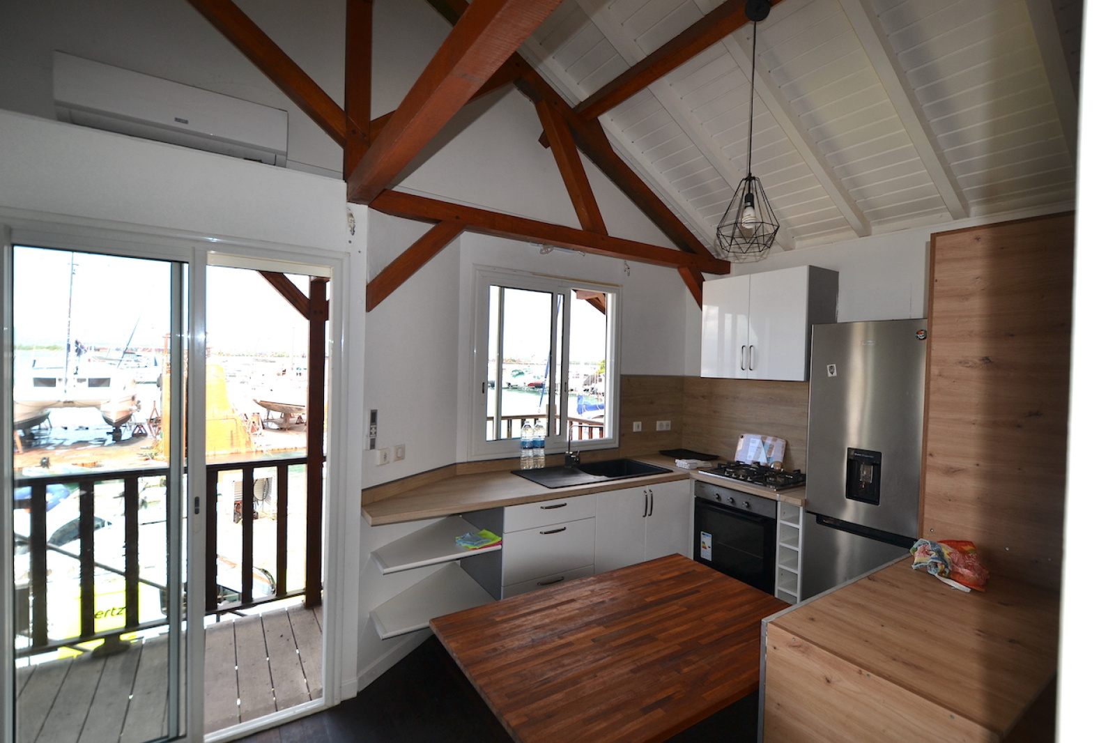 Dans un environnement assez atypique, je vous propose ce logement de type studio, meublé et neuf. Il est composé d'une cuisine équipée, d'une salle d'eau avec wc et MAL, d'un salon climatisé, et d'une chambre séparée intélligemment pour avoir pas mal de rangement. Sa situation est quelque peu particulière et ne conviendra pas à tout le monde. Il se trouve sur un chantier naval, donc avec les nuisances sonores le matin de 7H à midi, mais avec une très belle vue sur les bateaux, la mer et la montagne. Vous bénéficierez d'une place de parking en dessous du logement, et l'endroit est complètement sécurisé. A 5 mn à pied de Fouillole et10mn de la marina, l'emplacement est idéal. Le loyer est de 650e/mois charges comprises (eau et edf). Abonnement internet à la charge du locataire. Disponible tout de suite.
