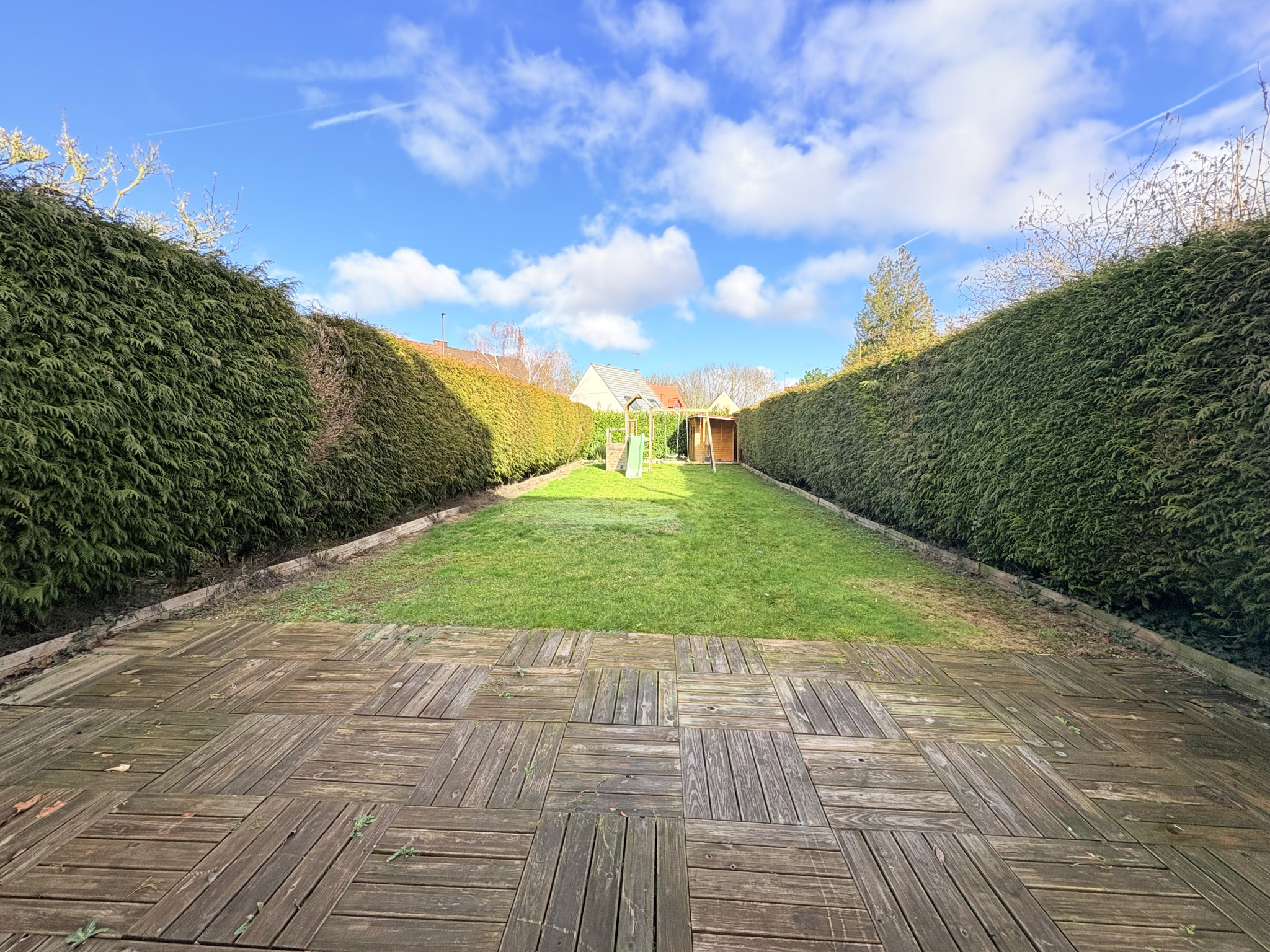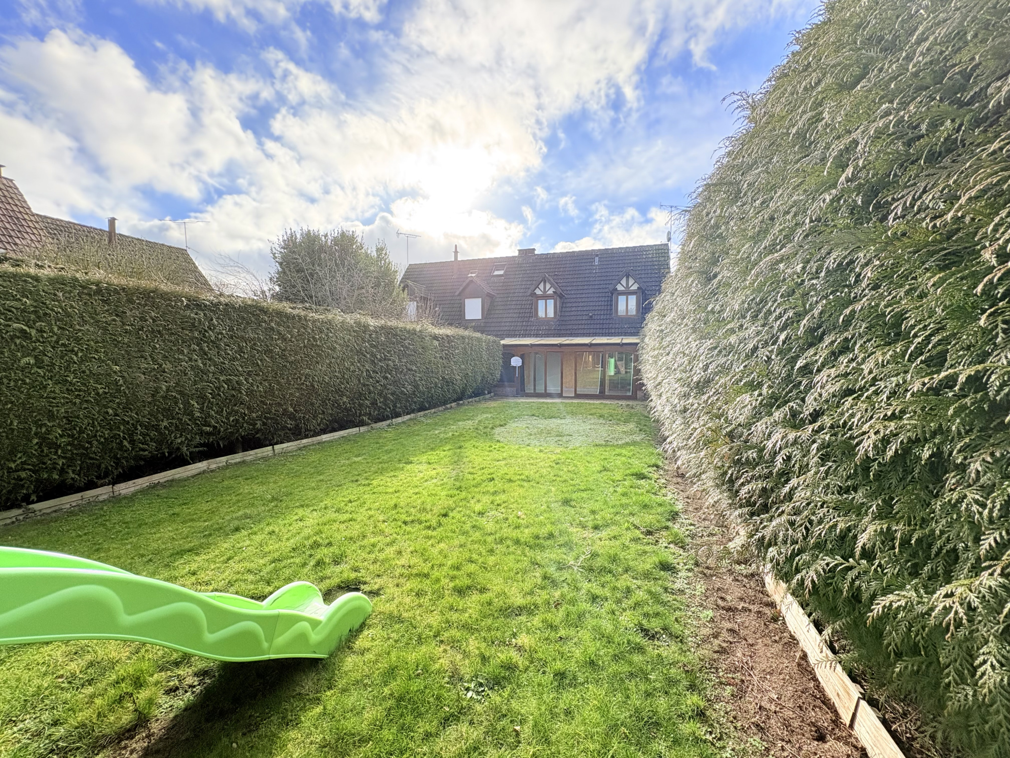 A l'éxterieur vous découvrirez une belle terrasse et un beau jardin entiérement clôturé, idéal pour vos belles soirées d'été!