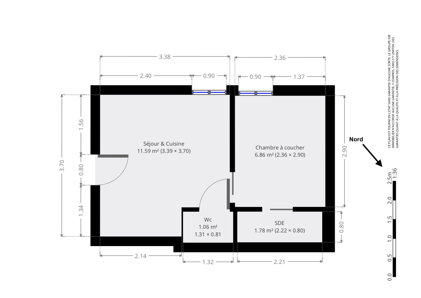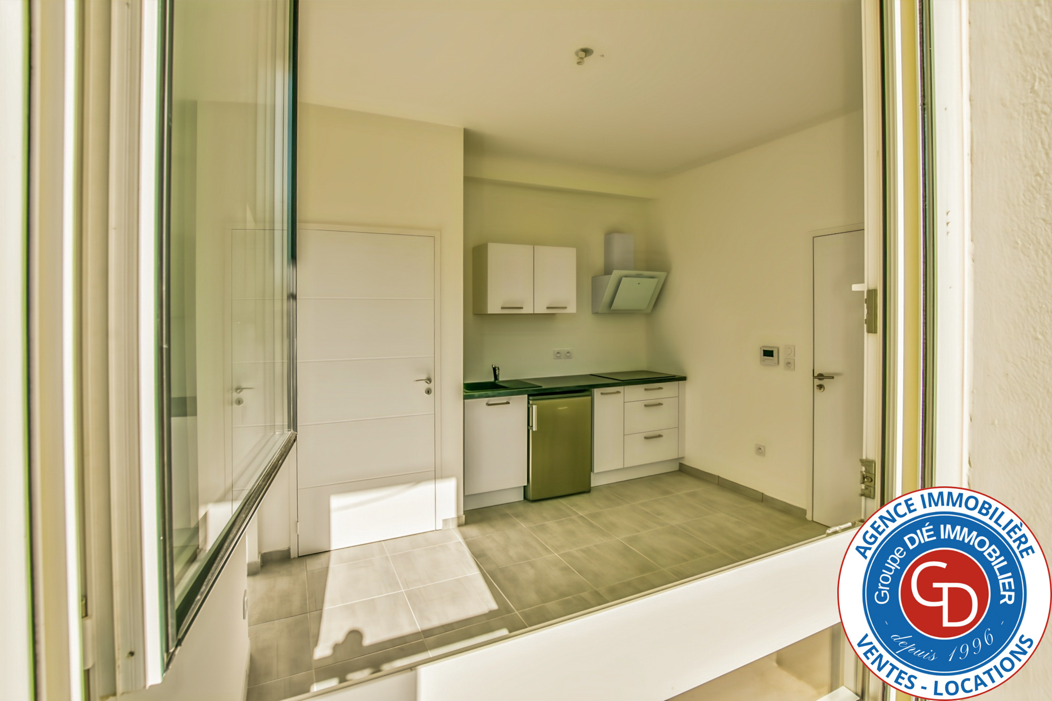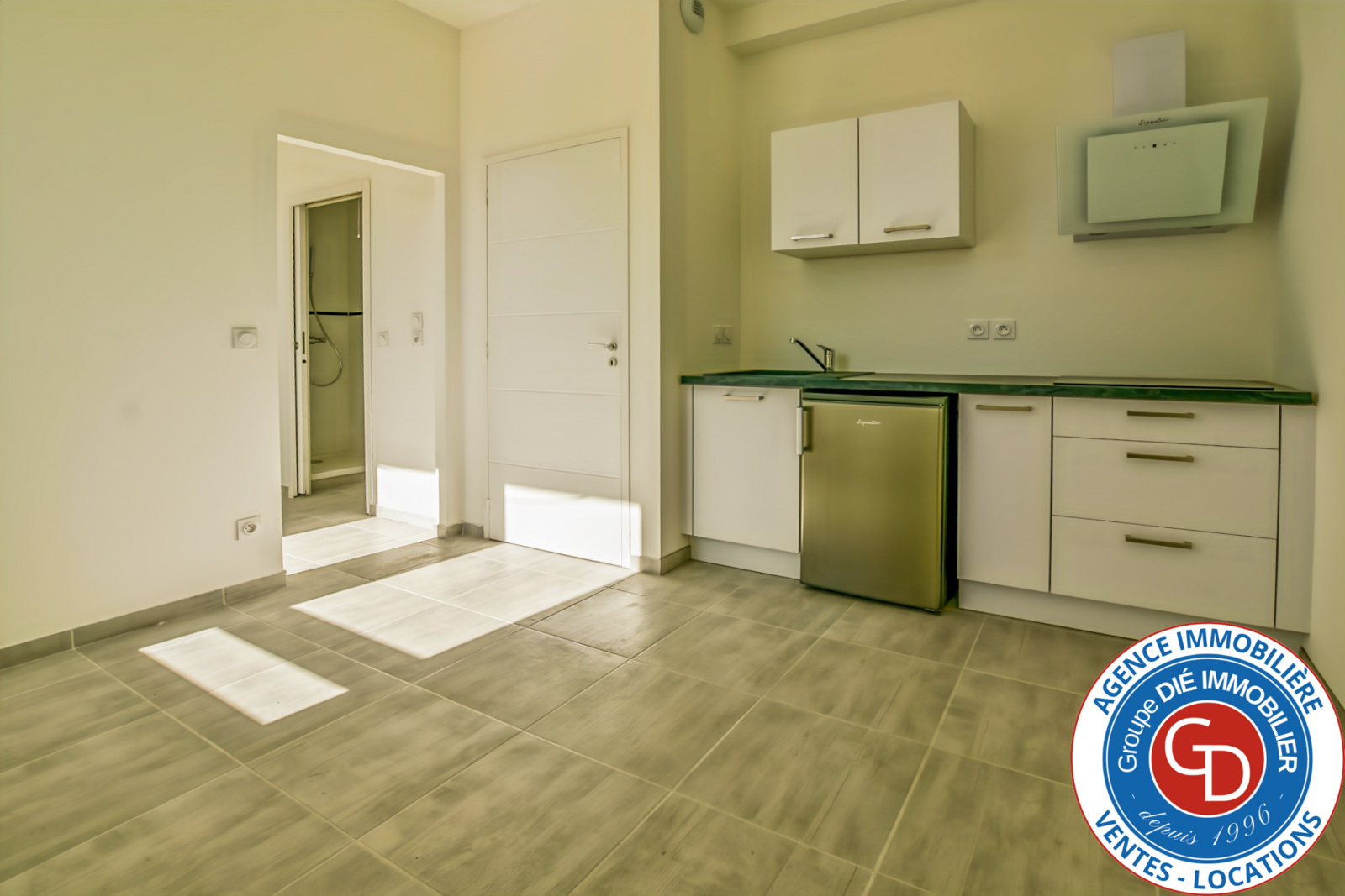 Séjour avec kitchenette avec une fenêtre, cabine avec fenêtre, salle d'eau, et wc indépendant.