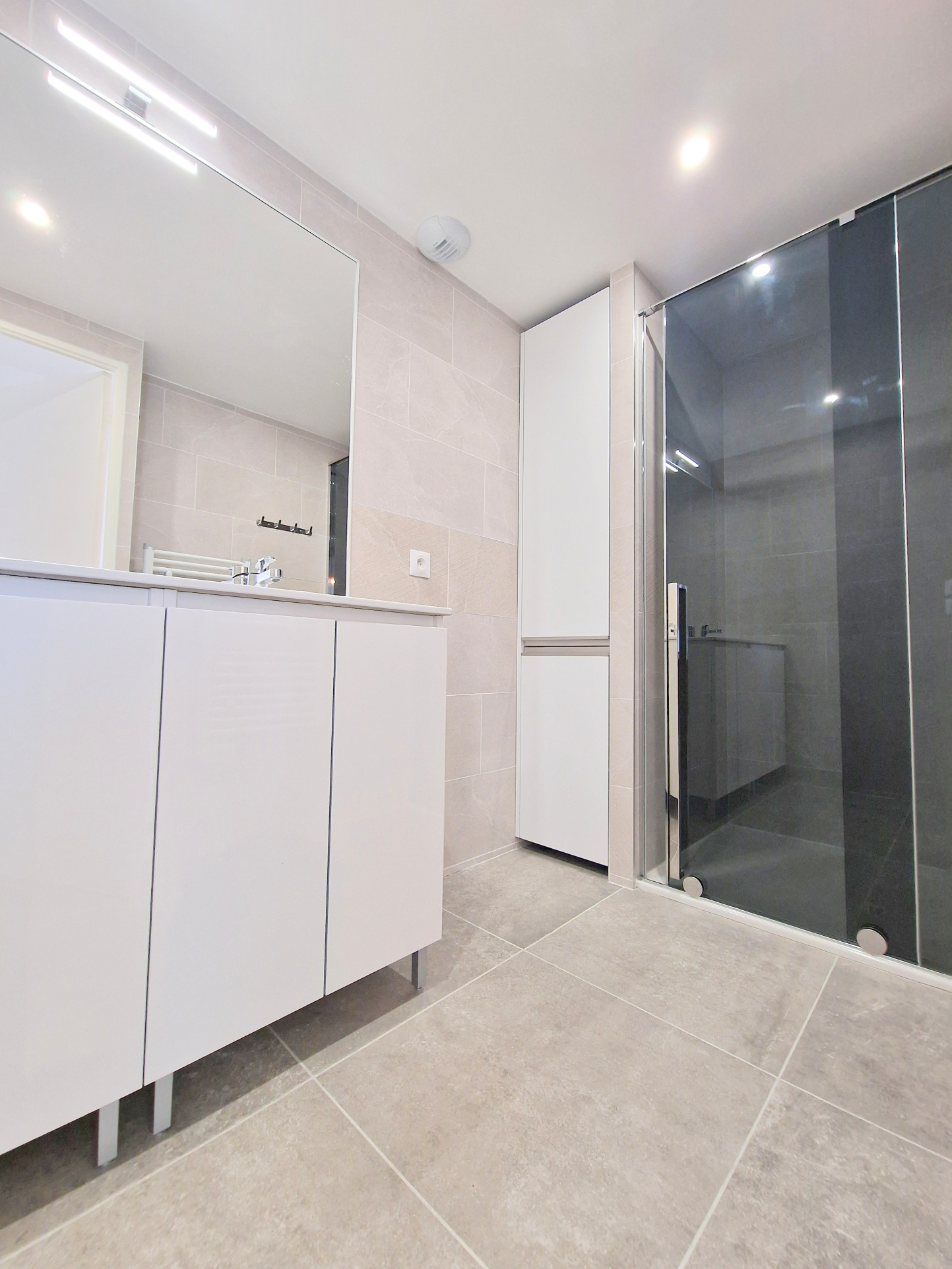 La salle d’eau avec douche dispose d’un meuble de rangement pleine hauteur avec de nombreux tiroirs. Double vasque. Miroir pleine hauteur et largeur.