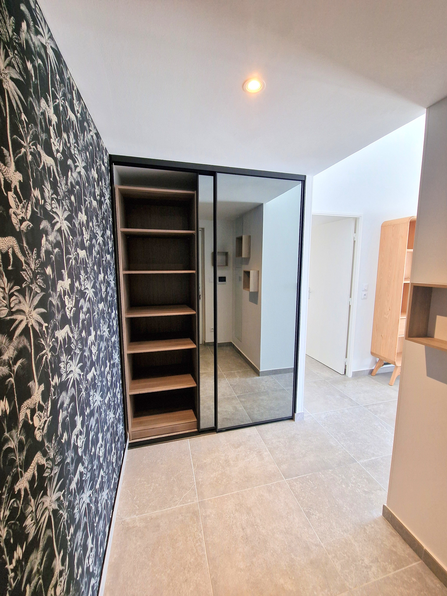 Les 2 chambres sont toutes les 2 aménagées d’un large placard / dressing pleine hauteur avec tiroirs, penderie et étagères :