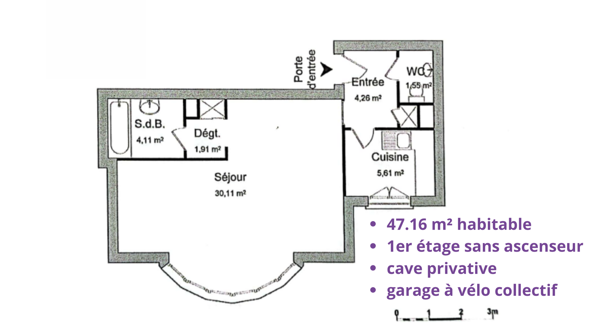 Cet appartement dispose d'une cave privative de 3,38 m² en sous-sol et d'un garage à vélo collectif pour plus de praticité.