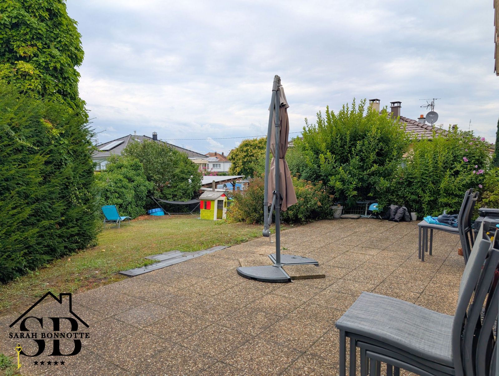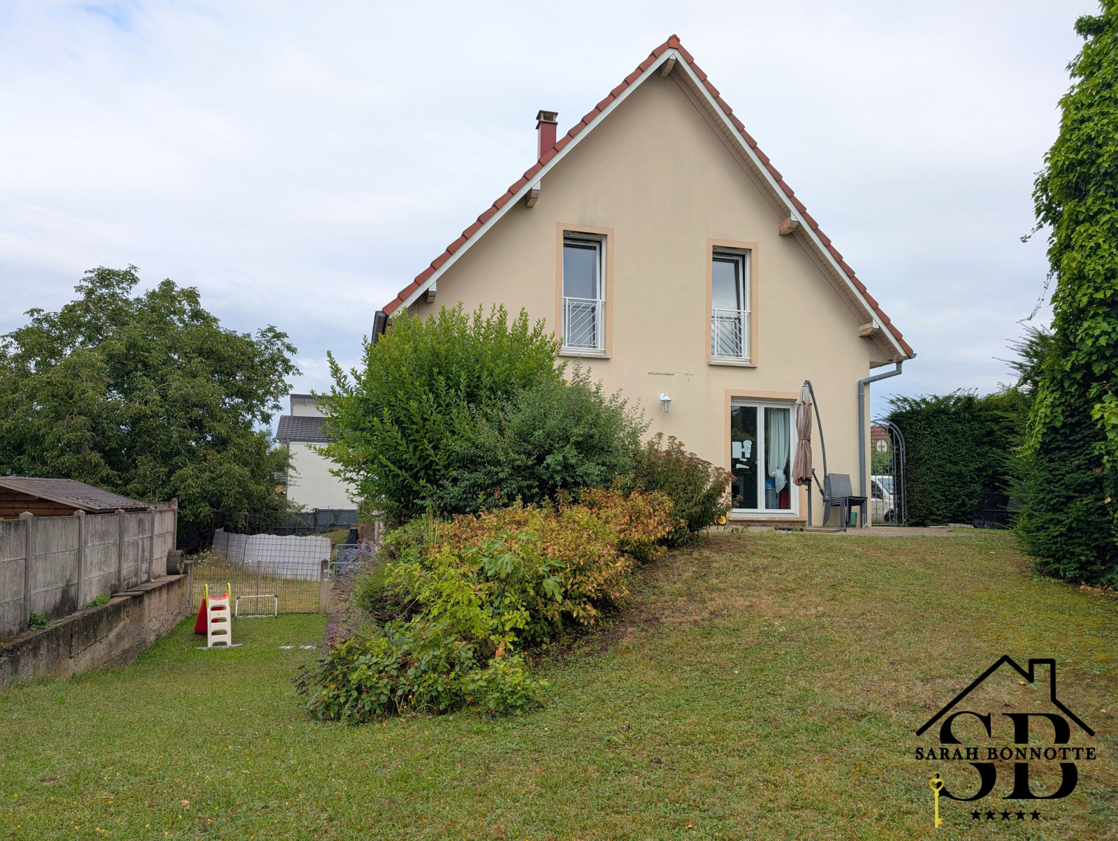 Maison mitoyenne (1 côté) construite en 2004 dans un quartier résidentiel verdoyant sans immeuble, d'une surface habitable de 131,49 m2 avec terrasse et jardin arboré, sous-sol carrelé, 1 garage, 2 places de parking privées.