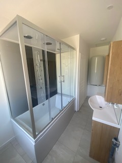 une pièce de vie de 25 m2 avec cuisine équipée ( four,plaque,hotte) une salle de bain douche, un wc