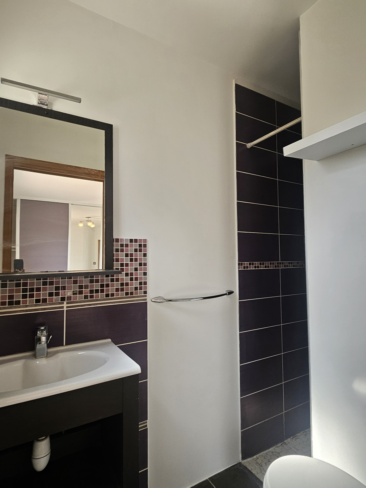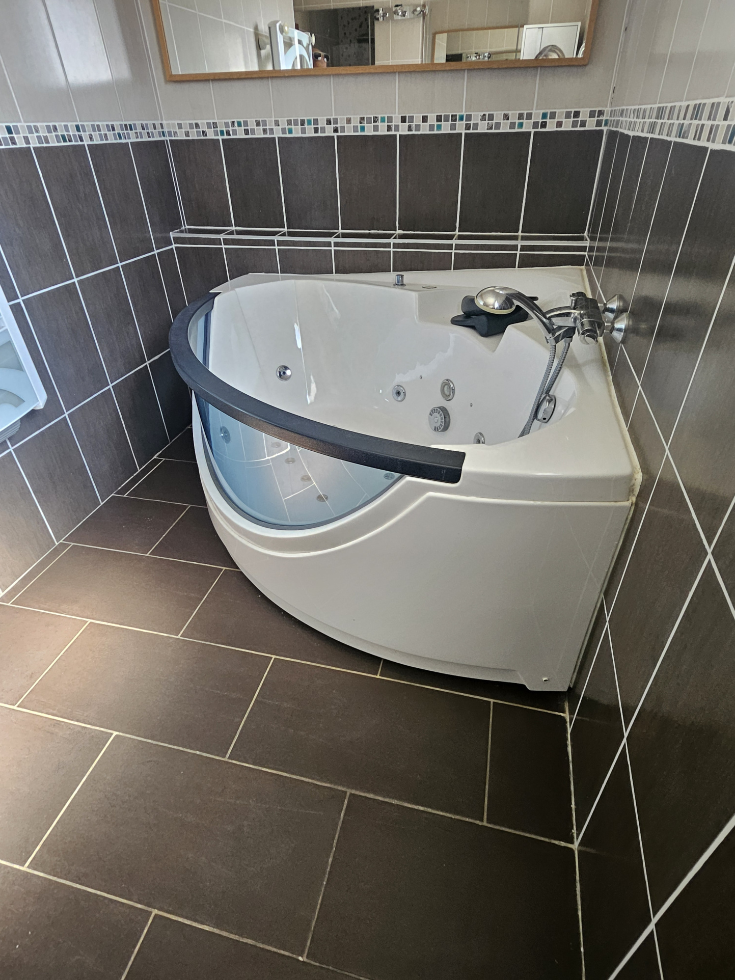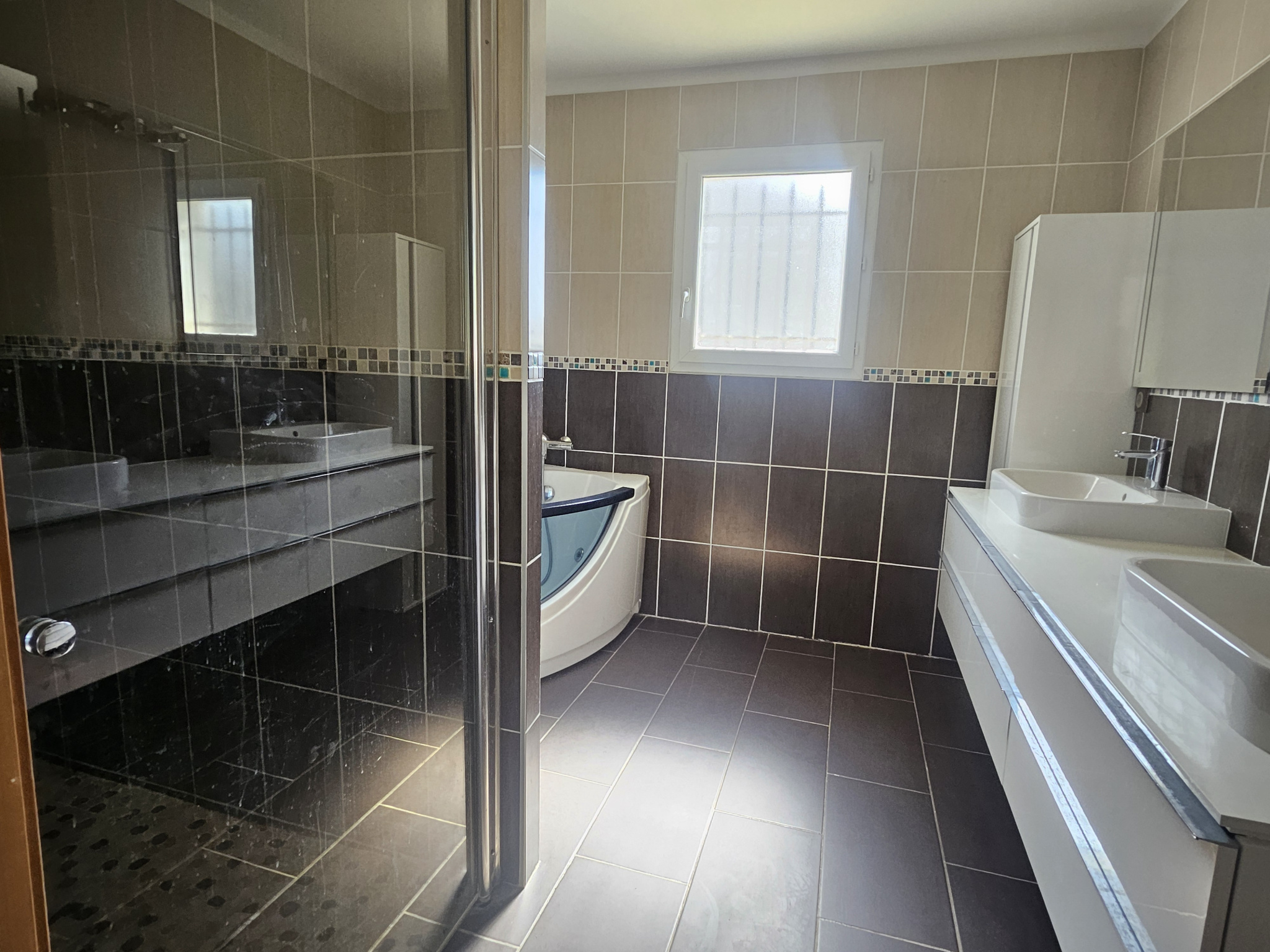 La maison comprend également une salle de bain équipée d’une douche, d’une baignoire et d’un meuble double vasque, ainsi que de nombreux espaces de rangement.