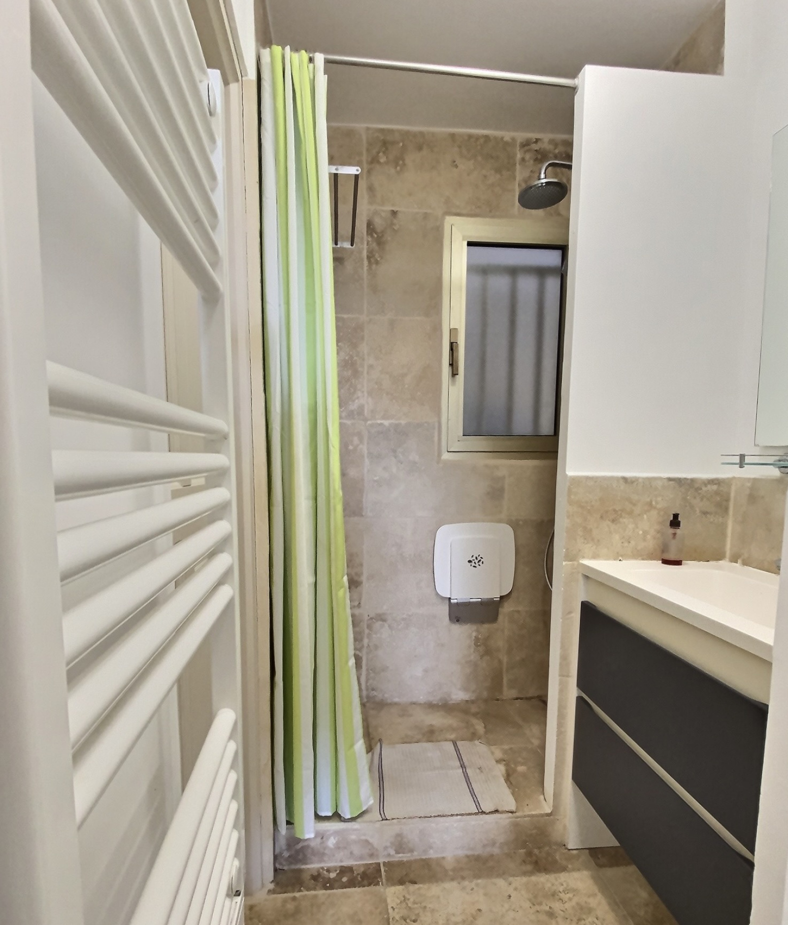 Il se compose d'une entrée donnant sur une cuisine américaine entièrement équipée, un beau séjour exposé sud donnant sur une très belle terrasse avec aperçu mer, une chambre, une salle d'eau avec wc.