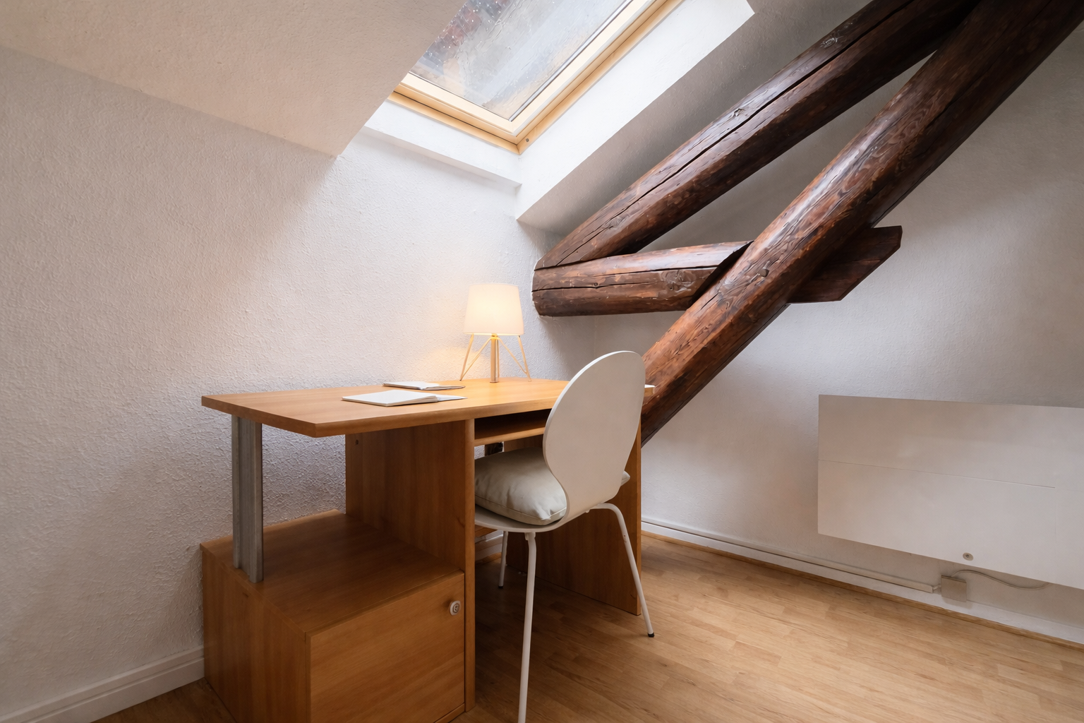 L’appartement est entièrement meublé et équipé. Il se compose de deux chambres, disposant chacune de leur propre salle de bain, d’un bureau, de rangements et de tout le mobilier nécessaire au confort des occupants.
