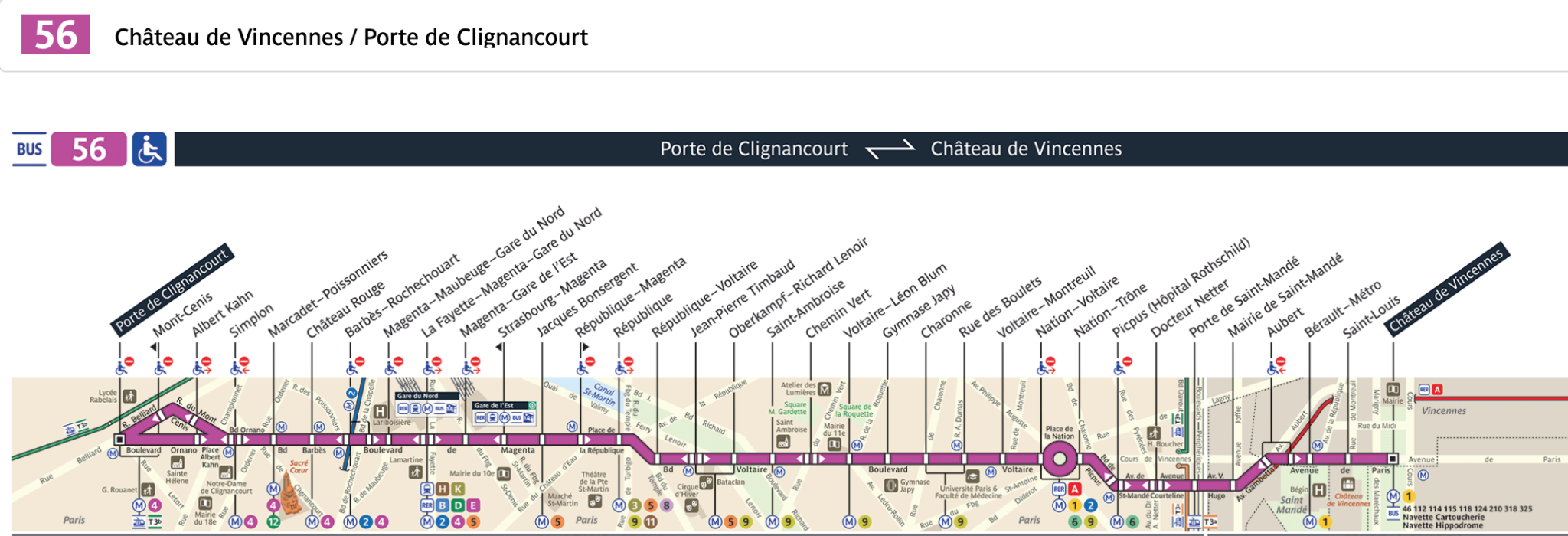 56 ; de la Porte de Clignancourt au Château de Vincennes en passant par République, Nation, Picpus/hôpital Rothschild.