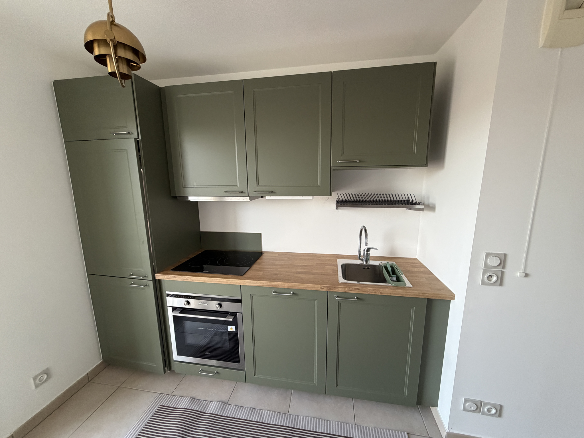 Cuisine : Espace neuf et entièrement équipée (plaques, four, hotte aspirante, lave vaisselle et combiné frigo/congélateur).