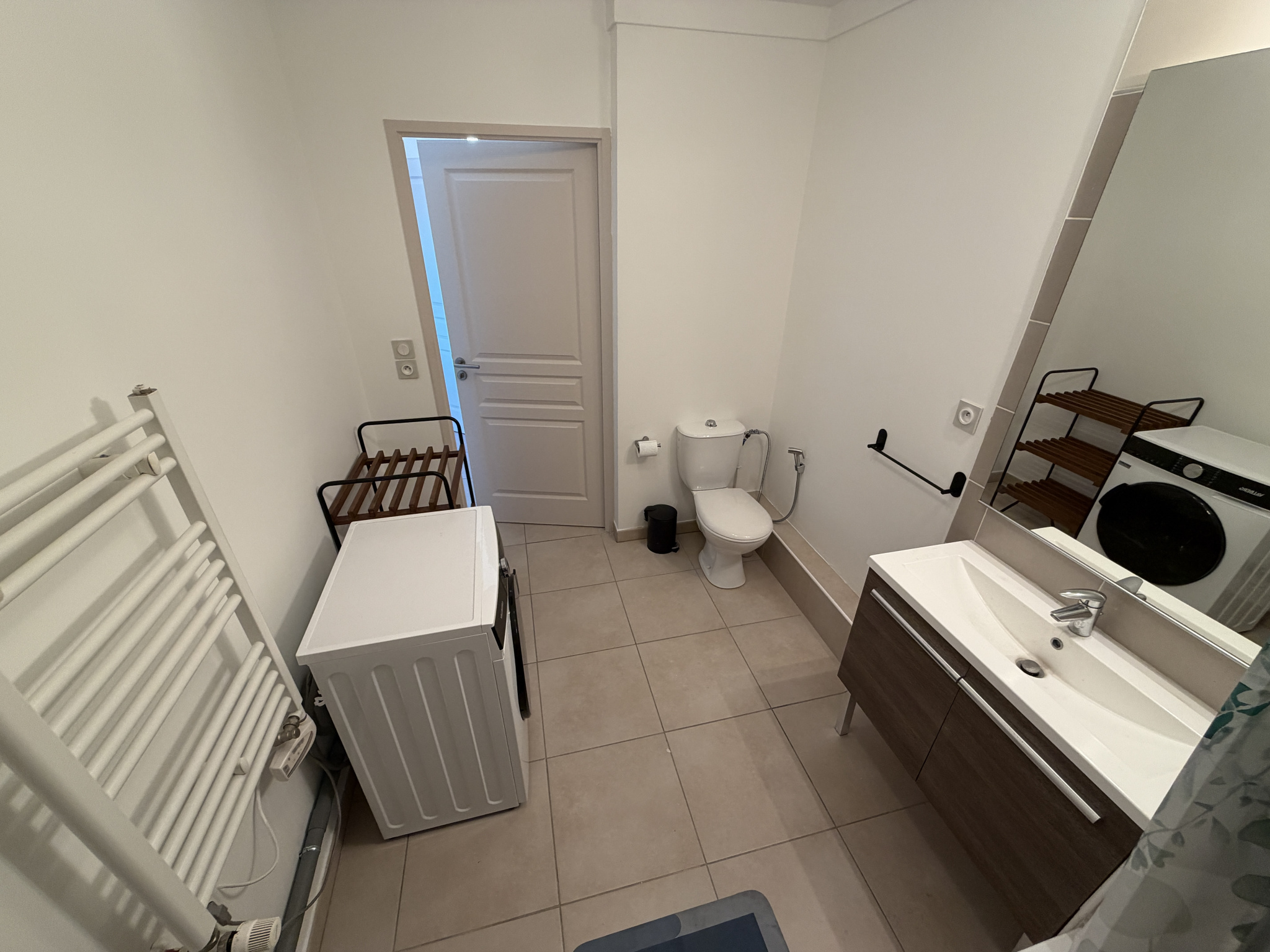 SDB/WC : équipée d'une baignoire, d'une machine à laver toute neuve et rangement.