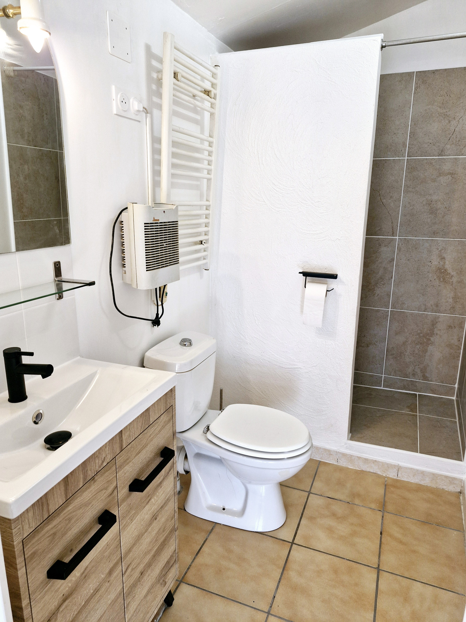 Le logement se compose d'un bel espace de vie avec cuisine équipée neuve, espace salon et climatisation. Vous trouverez également une belle chambre avec placard et une salle d'eau avec WC.