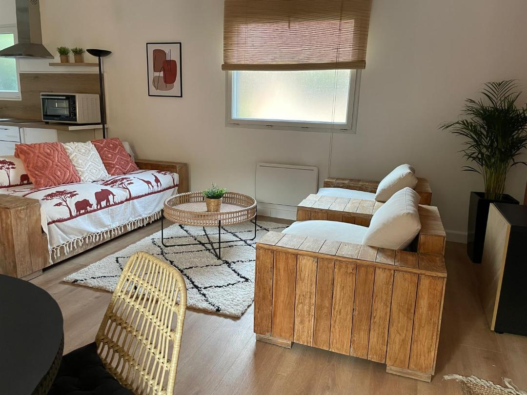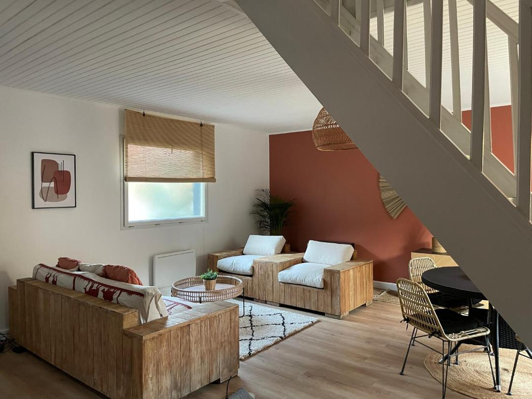 Au rez-de-chaussée, une piéce de vie chaleureuse, une cuisine semi-équipée, une salle de bains.