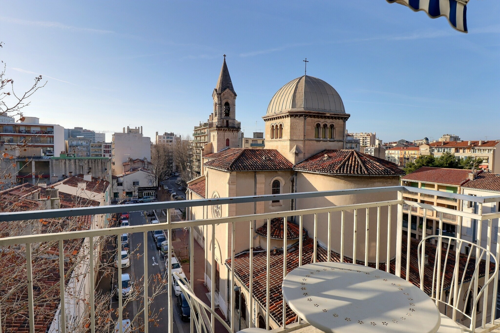 Au 5ème et avant dernier étage, une belle vue dégagée sur la vallée de l'Huveaune d'un côté et une vue sur le clocher de l'église Saint Pierre de l'autre.