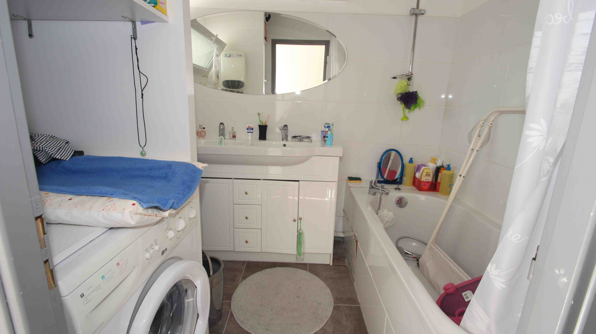 Salle de bain avec Baignoire, double vasque, rangement, emplacement machine à laver.