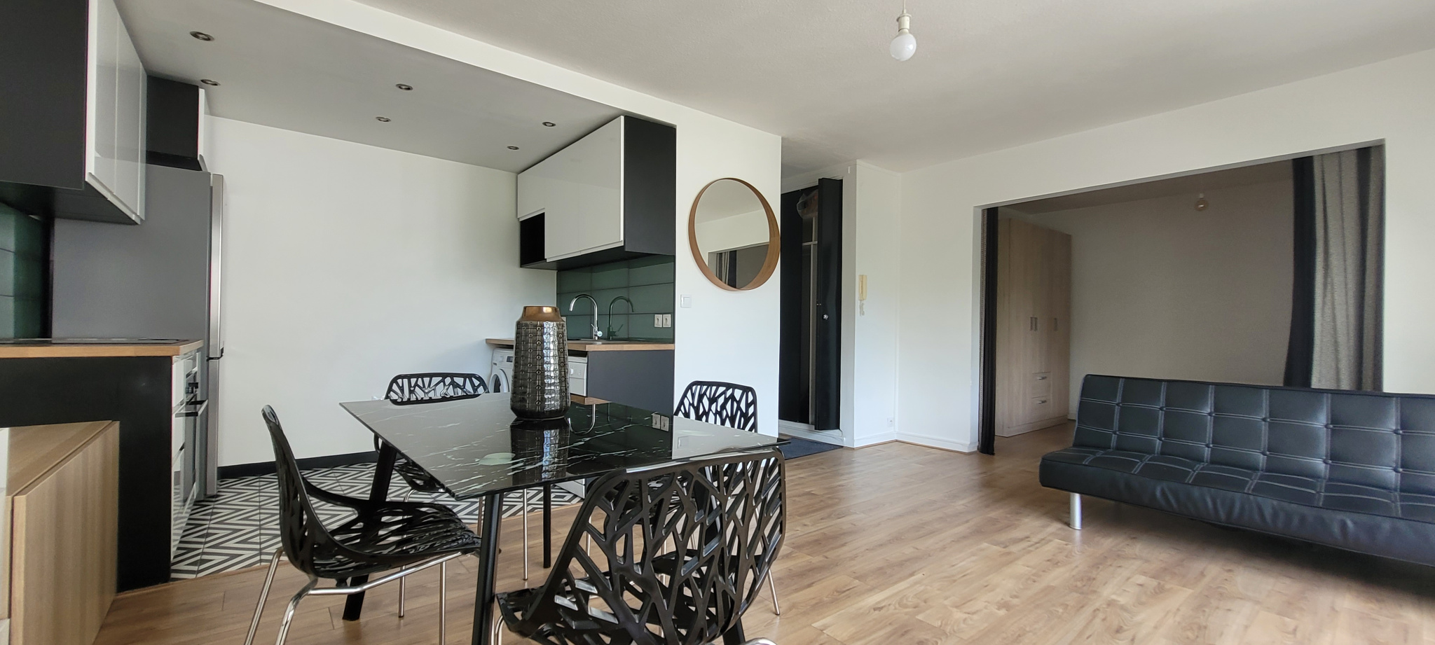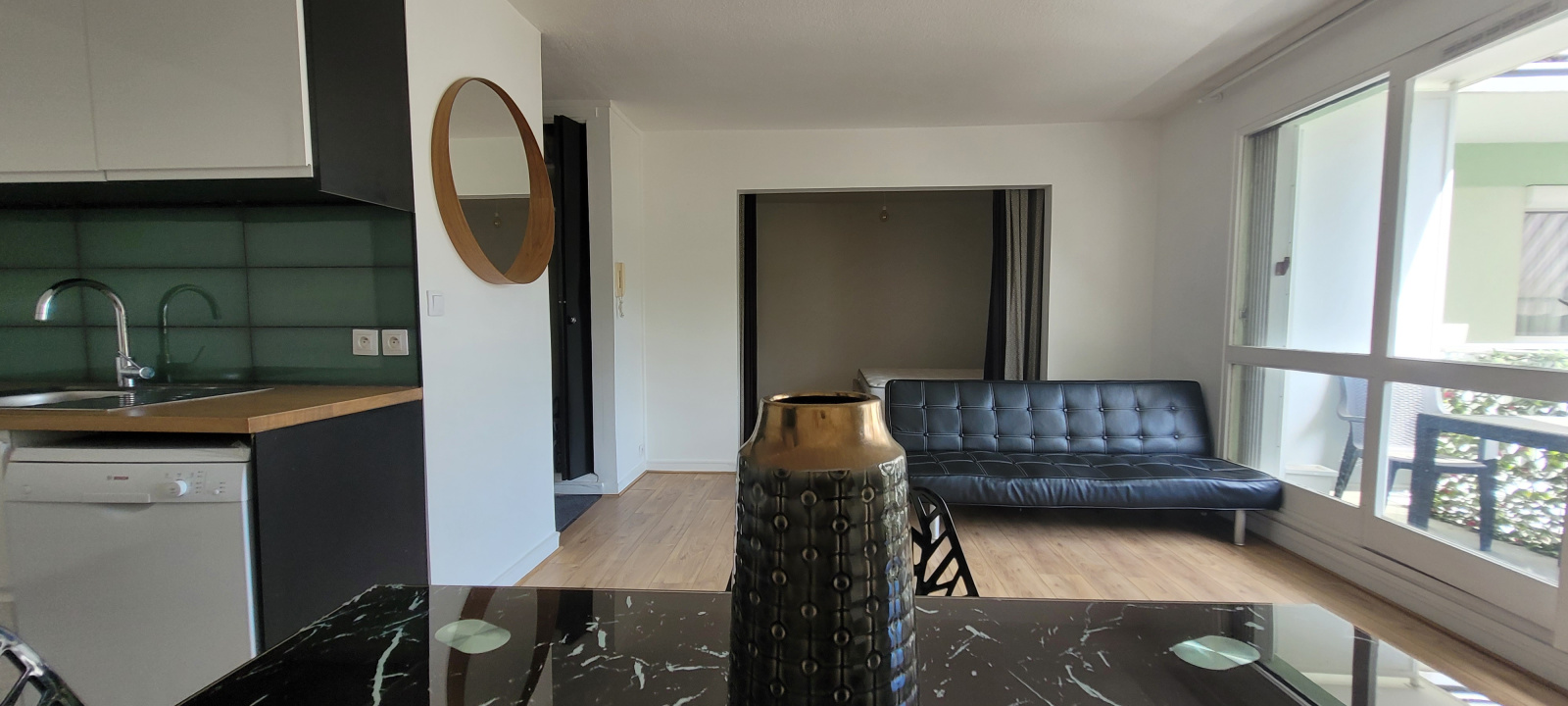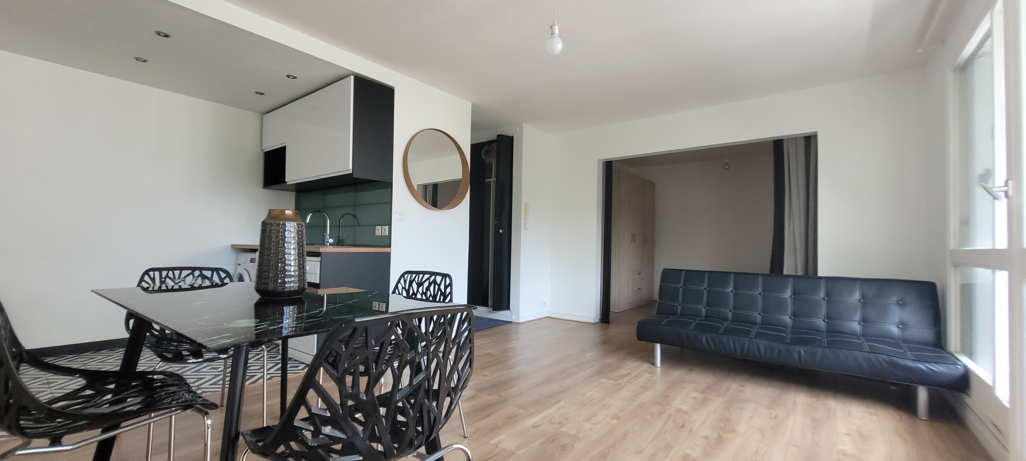 IVRY SUR SEINE - 94200 à 9 MONUTES A PIED DU METRO MAIRIE D'IVRY ou 11 MINUTES A PIED DU METRO PIERRE MARIE CURIE - L7, nous vous proposons à la Location Meublée ce bel appartement de T1 BIS, de 44 Mètres carré carrez bien distribué, situé au 2ème étage avec ascenseur d'un Immeuble de 1972 très bien entretenu et sécurisé avec gardienne. Il se compose d'une entrée, d'un spacieux séjour donnant sur un balcon de 5 Mètres carré, une cuisine ouverte et totalement équipée, d'un espace chambre offrant une salle d'eau, une toilette indépendante. CALME/LUMINEUX. Exposition SUD. Vue sur le JARDIN arboré.A VISITER ABSOLUMENT
