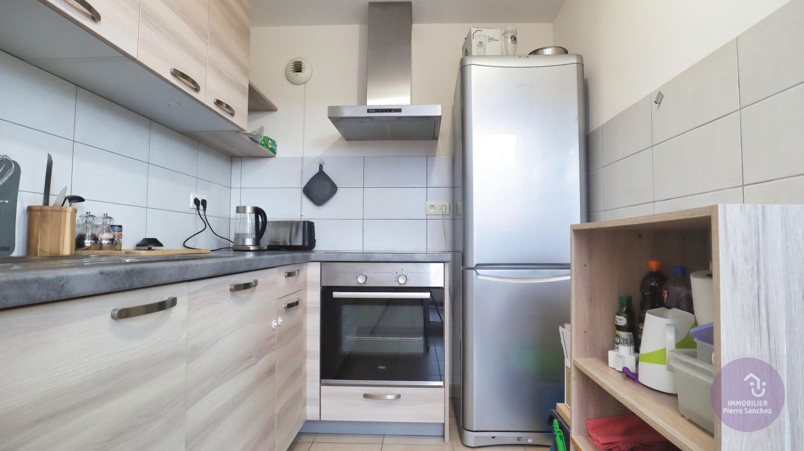 plaque de cuisson vitrocéramique (4 feux), hotte avec filtre, four encastré, lave-vaisselle encastré, réfrigérateur - congélateur et VMC