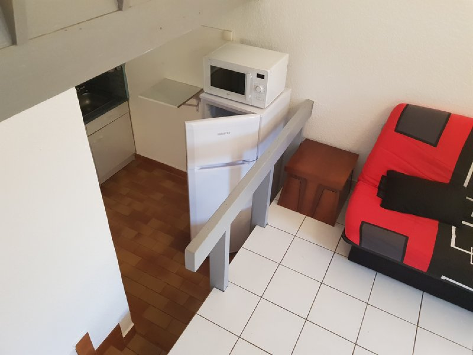 La maison dispose d'une pièce principale avec un coin cuisine et d'une salle de bain. En mezzanine fermée, on retrouve la chambre avec un grand placard.