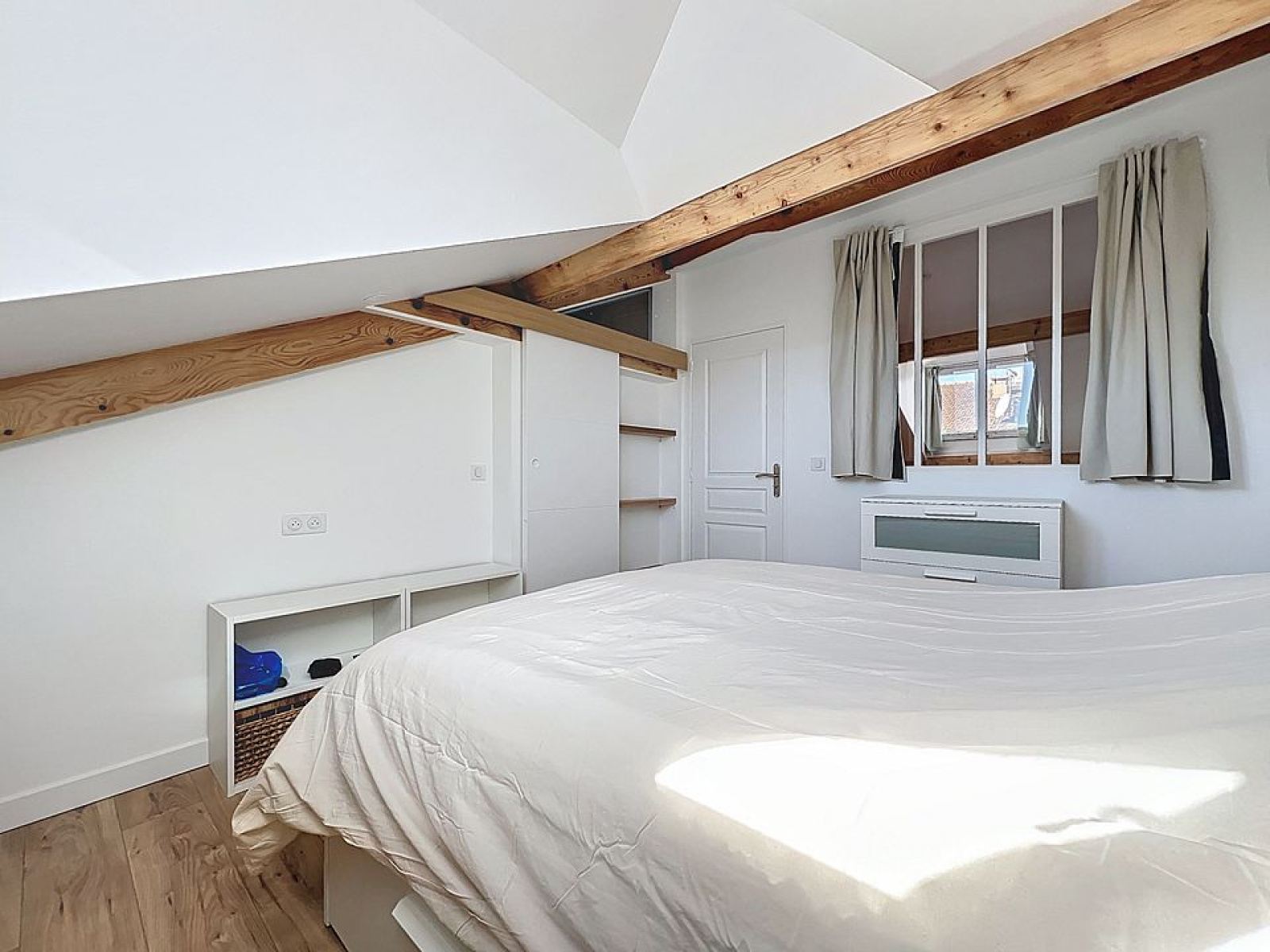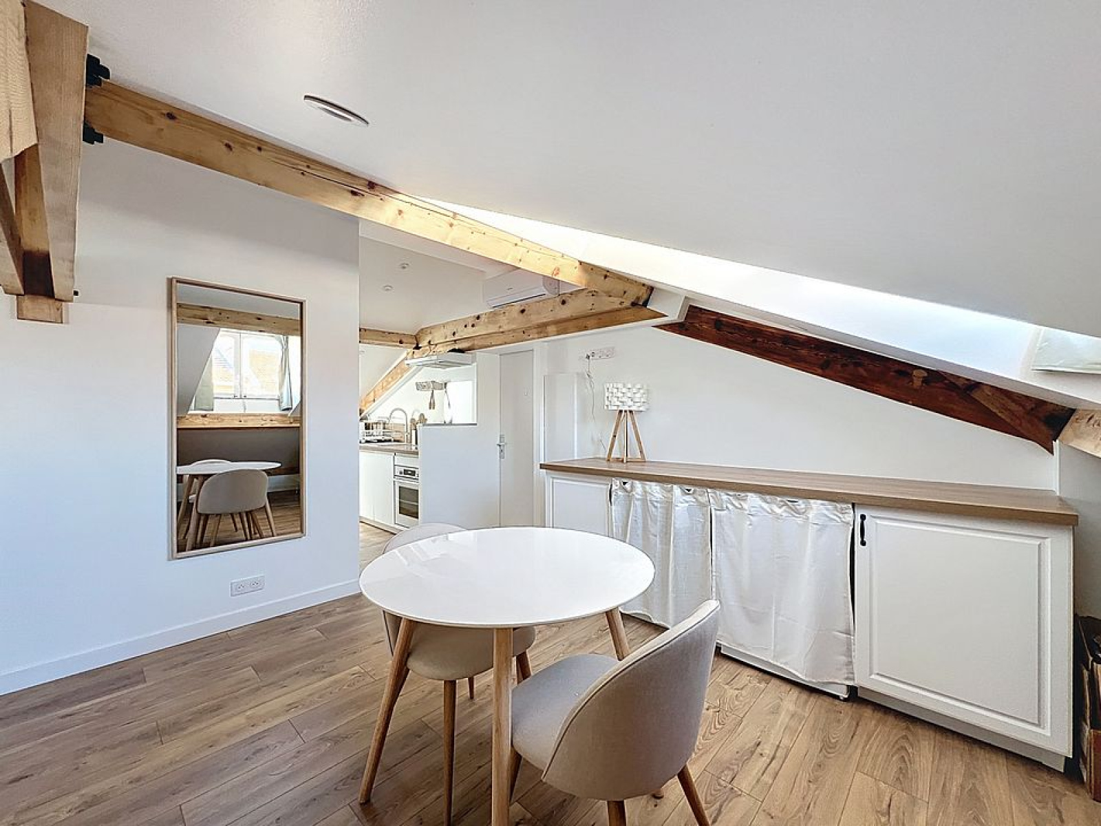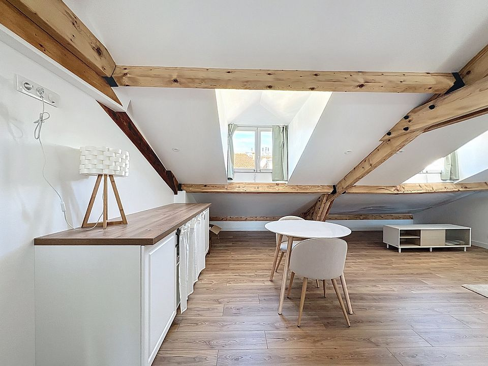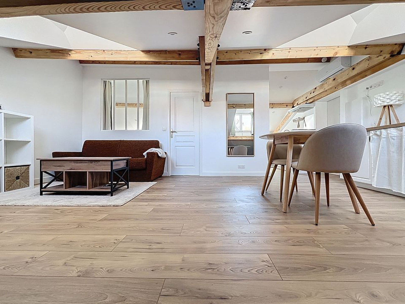 D’une superficie de 31 m² Carrez et 61 m² au sol, cet appartement entièrement rénové offre de beaux volumes et une atmosphère chaleureuse grâce à son sol en parquet et ses poutres apparentes.