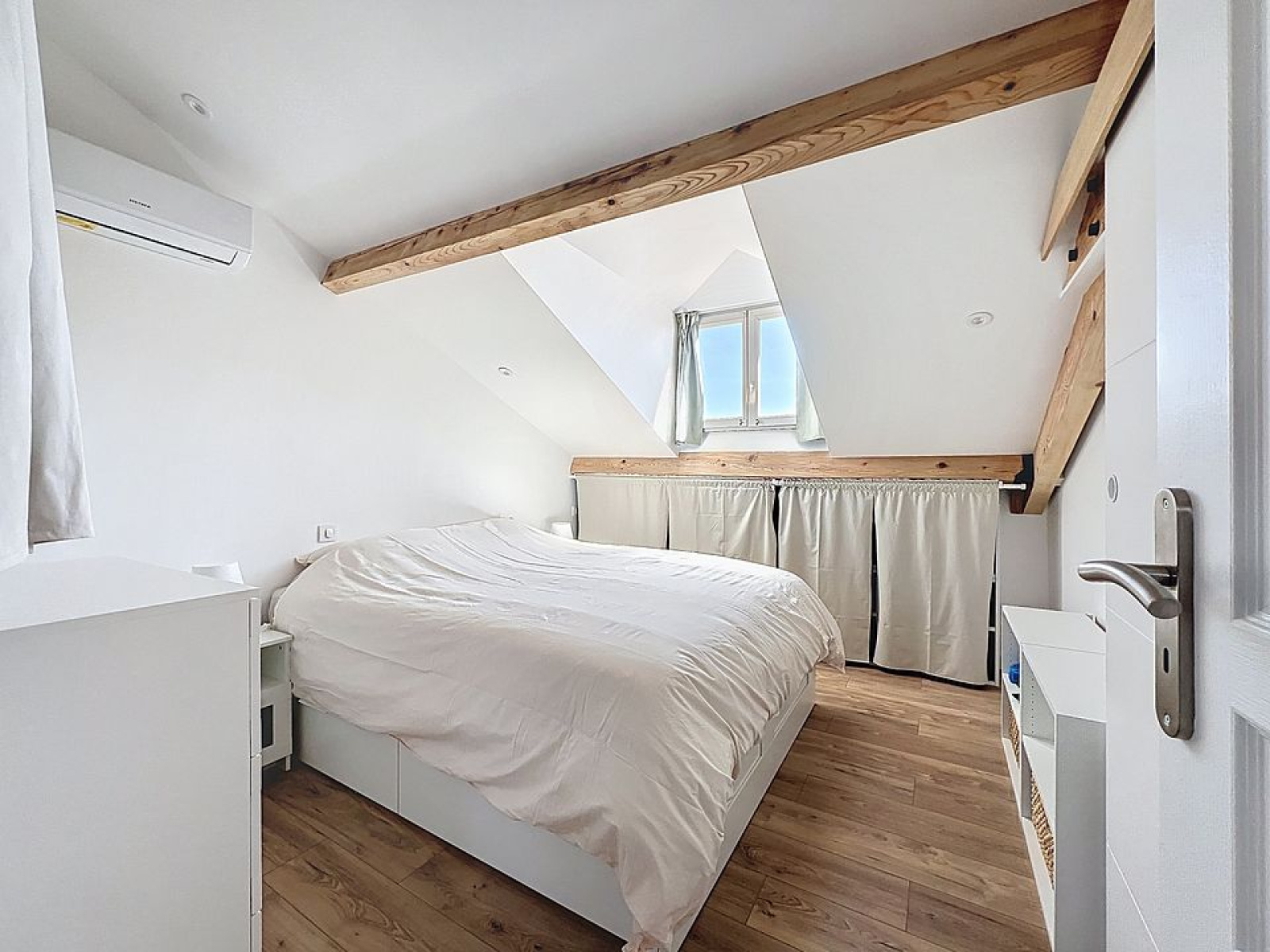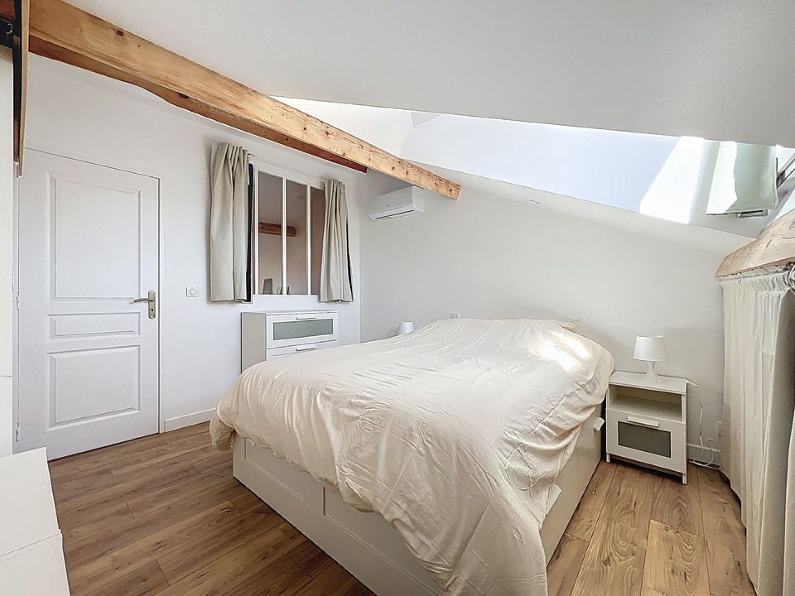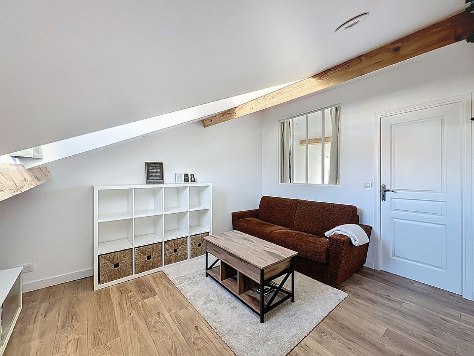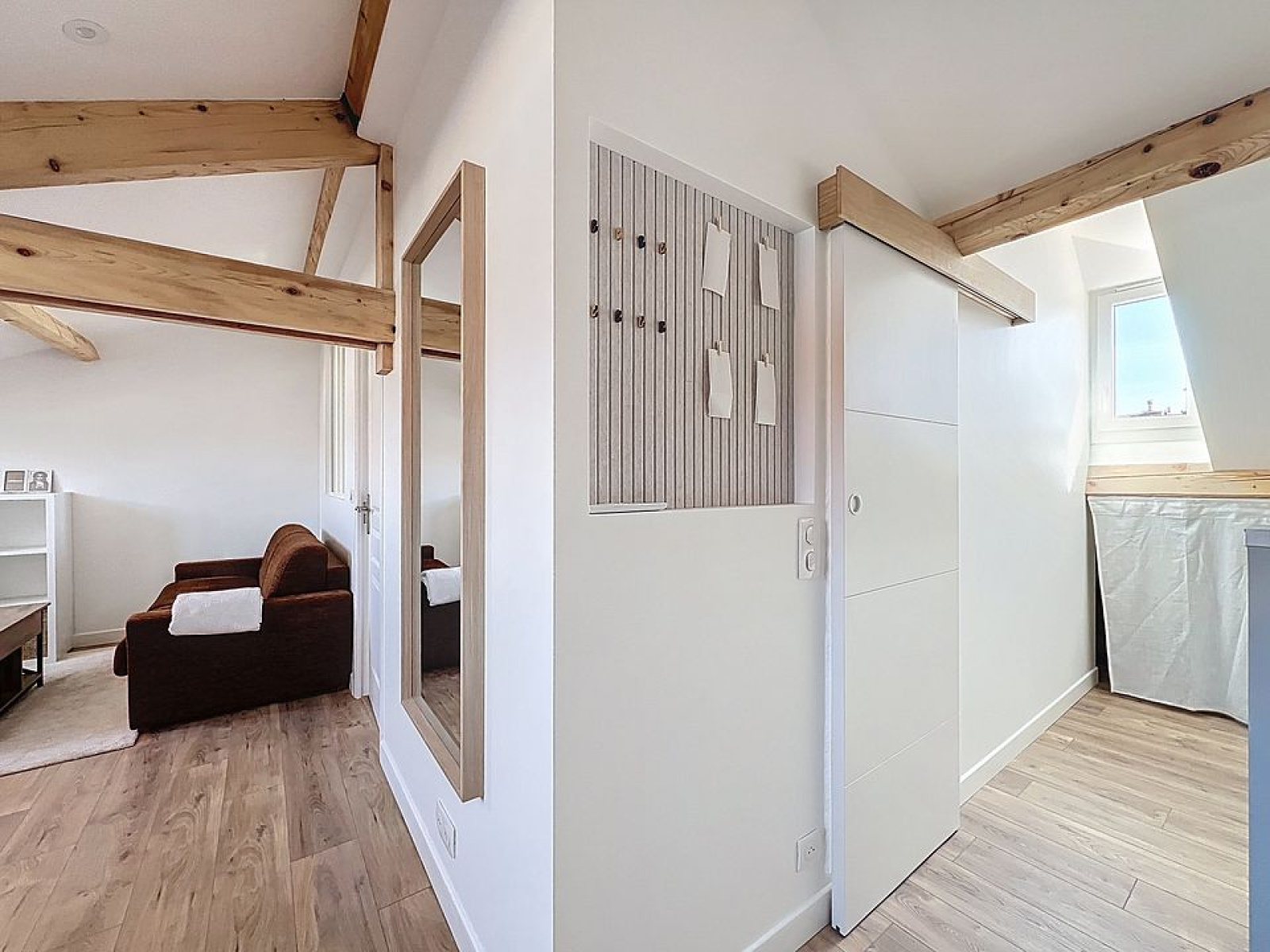 D’une superficie de 31 m² Carrez et 61 m² au sol, cet appartement entièrement rénové offre de beaux volumes et une atmosphère chaleureuse grâce à son sol en parquet et ses poutres apparentes.