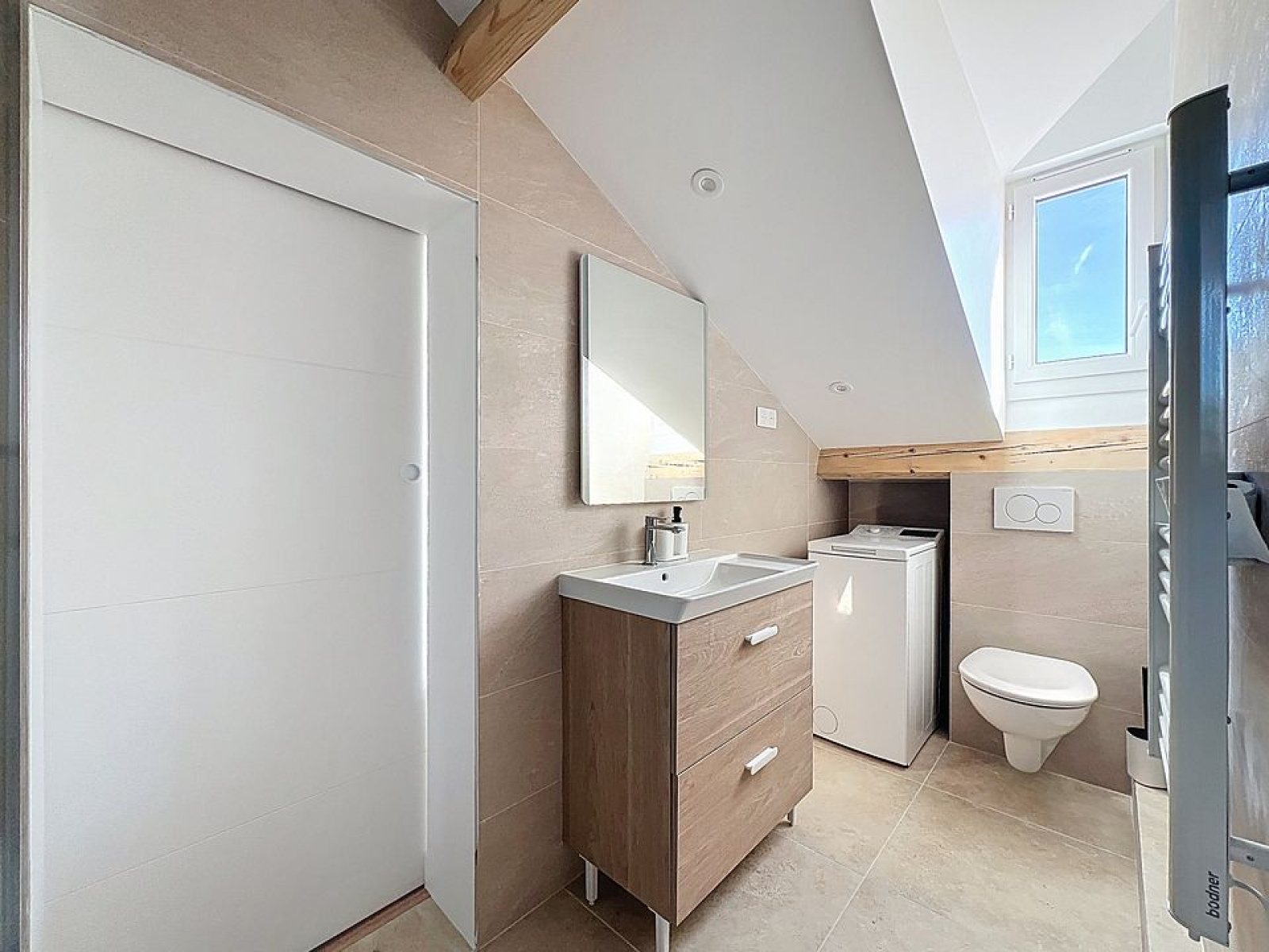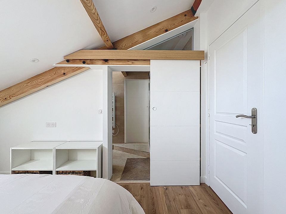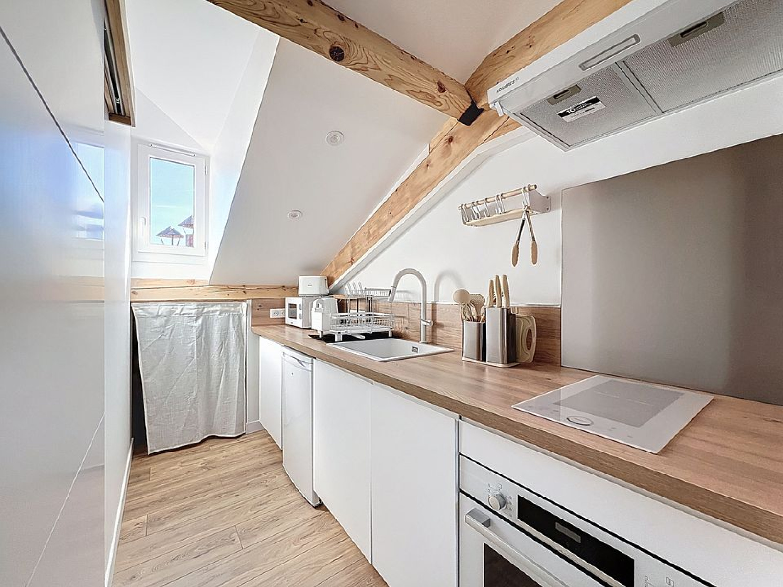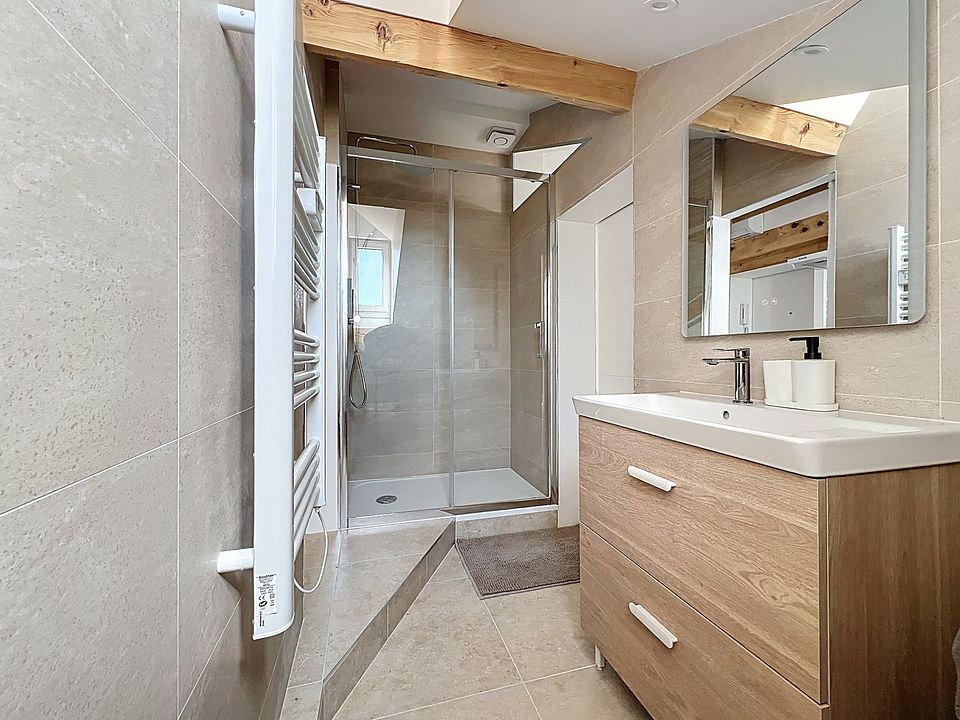 D’une superficie de 31 m² Carrez et 61 m² au sol, cet appartement entièrement rénové offre de beaux volumes et une atmosphère chaleureuse grâce à son sol en parquet et ses poutres apparentes.