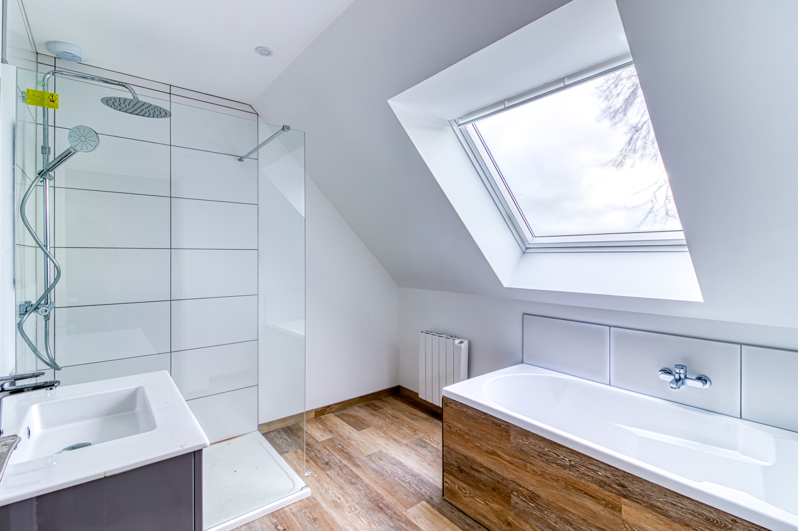 A l'étage, trois belles chambres, une salle de bains avec douche et baignoir, vasque.
