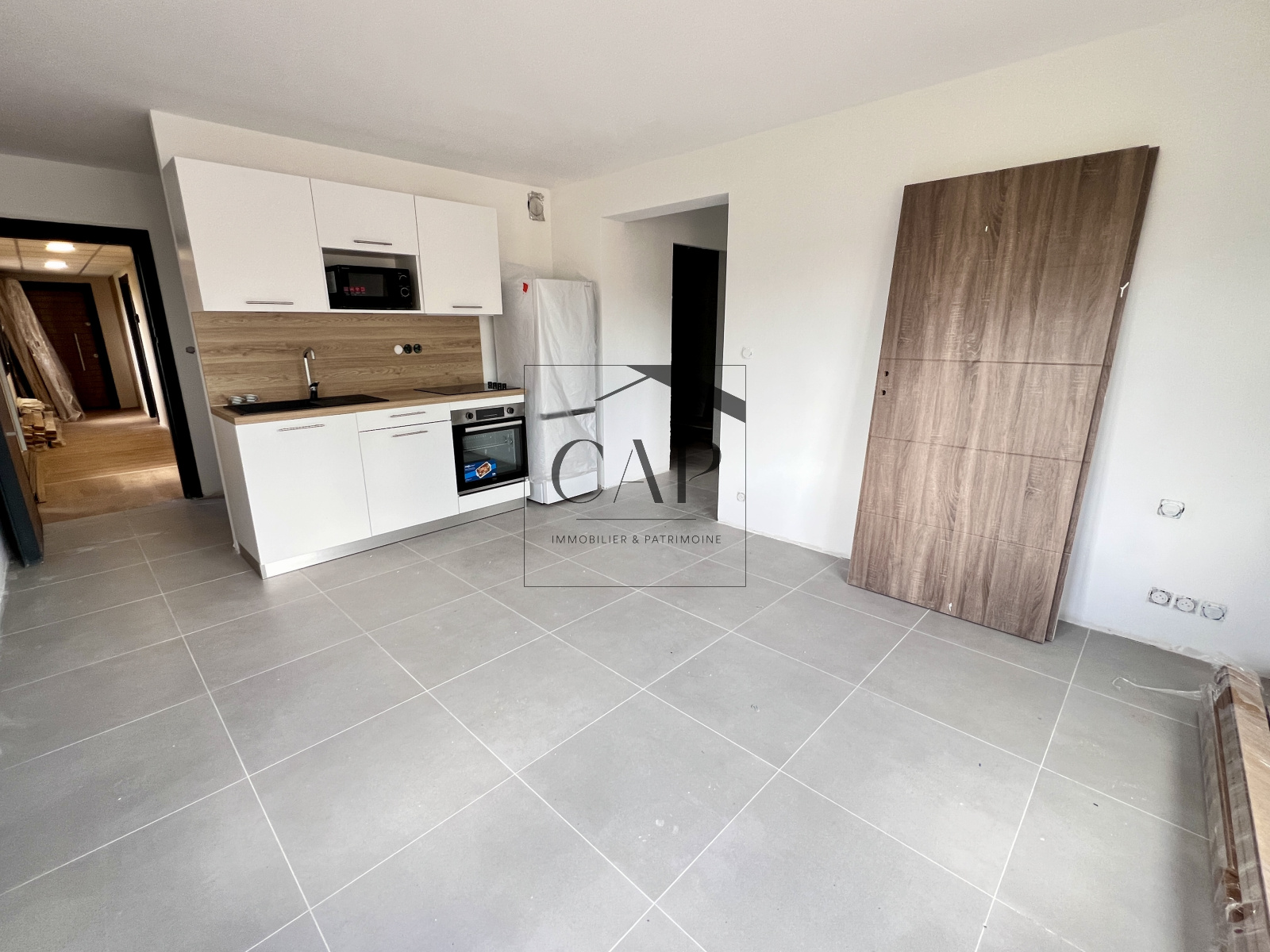 Une pièce de vie avec cuisine équipée s'ouvrant sur la terrasse de 7m²