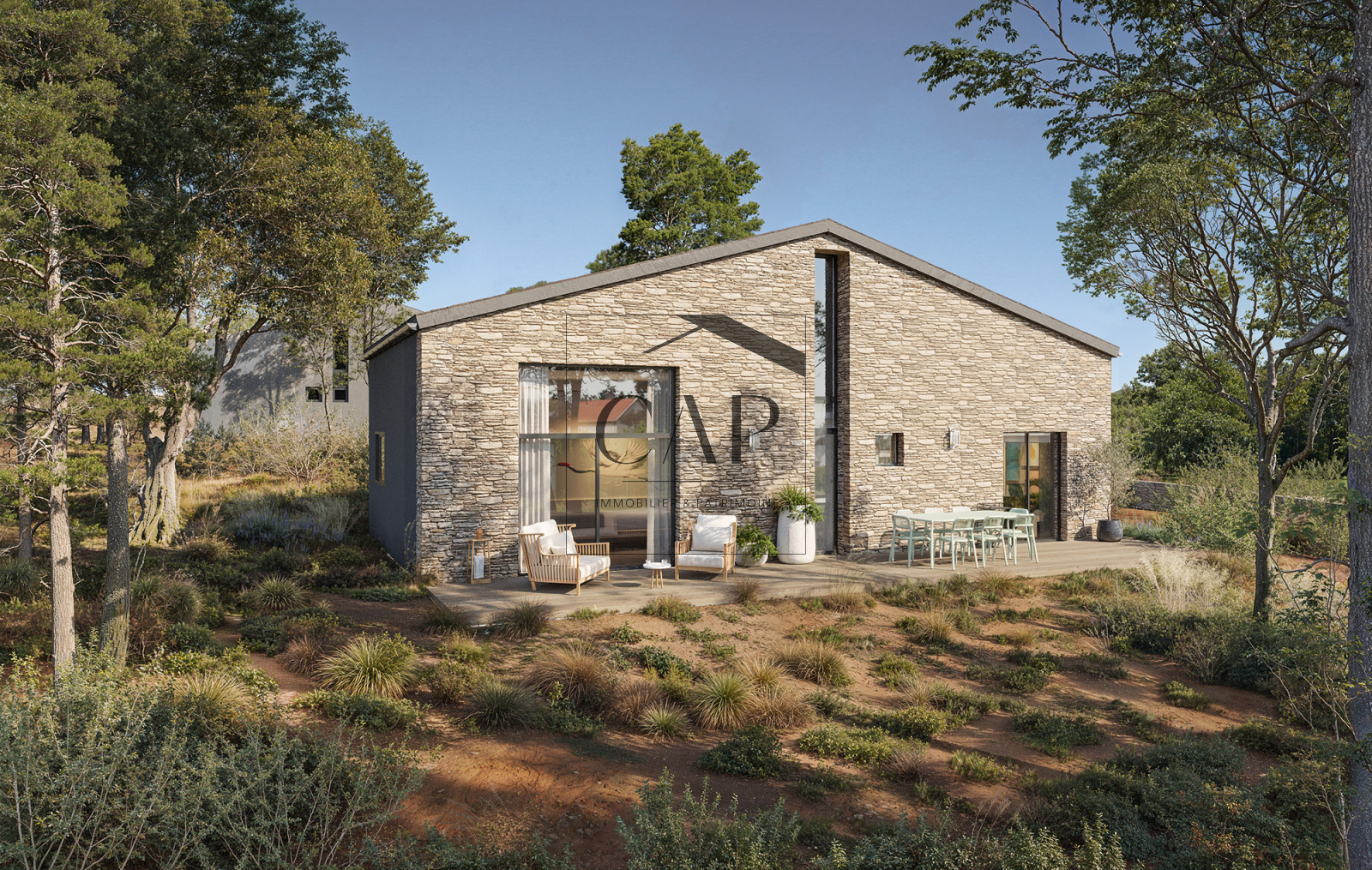 Cette maison dispose d’une terrasse de plus de 25m² et d’un jardin paysager de 649m² avec piscine en sus en option.