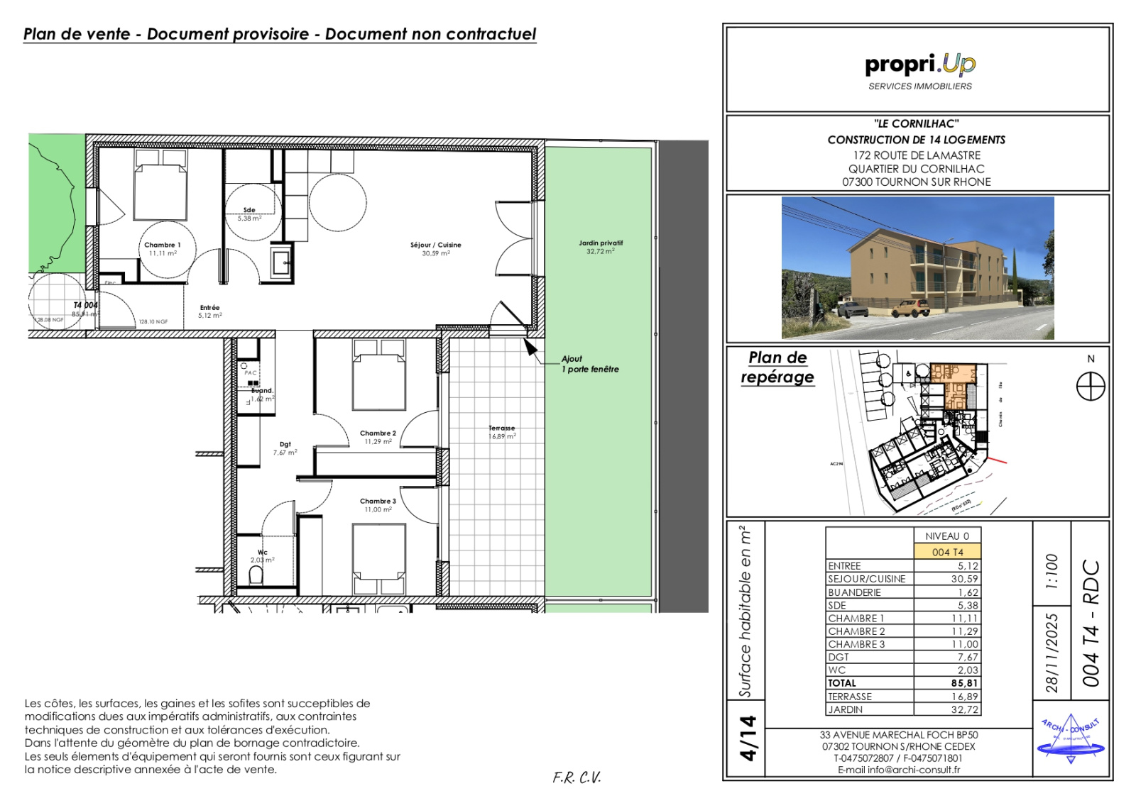 Route de Lamastre, dans une résidence neuve de 14 logements (T2 à T4), découvrez ce T4 en rez-de-jardin de 85,91 m² avec terrasse 16,89 m² et jardin privatif 32,72 m².
