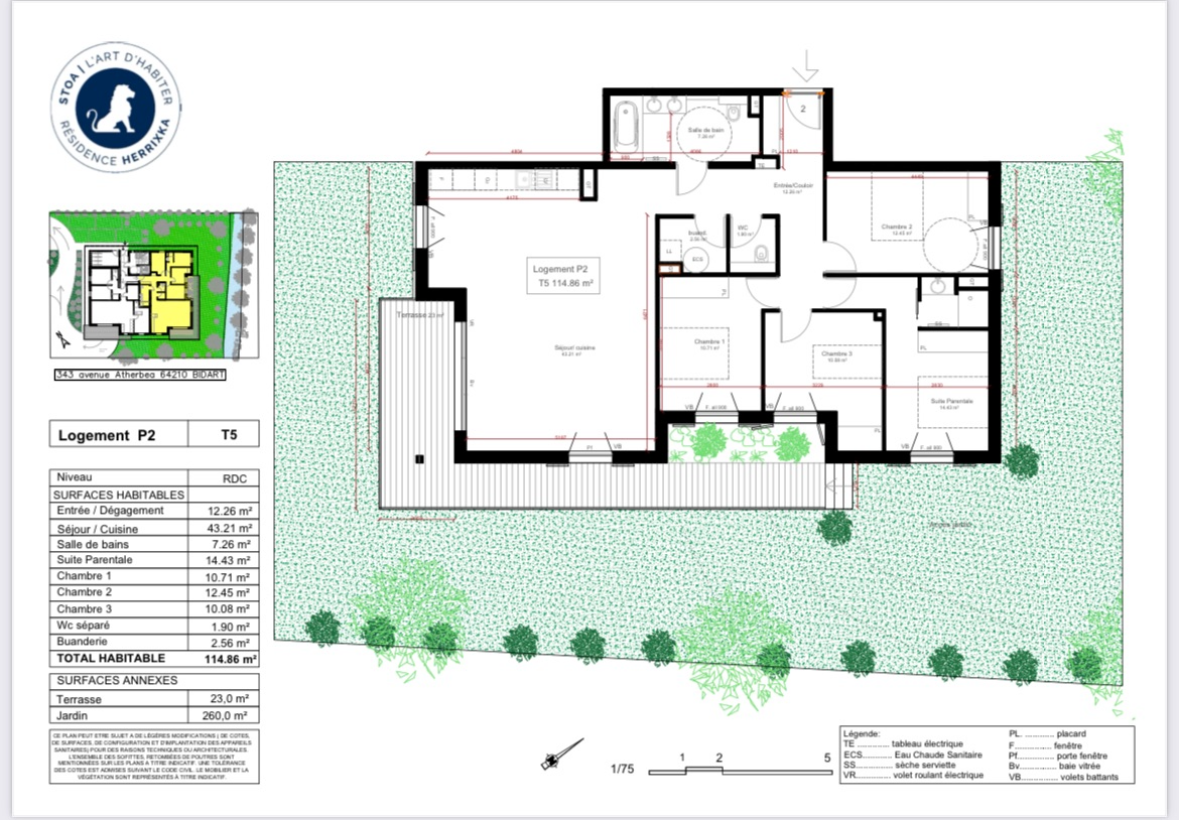 Appartement neuf T5 dans une résidence de standing située à Bidart : 111 m2 avec terrasse (23 m2) et jardin (260 m2) en rdc exposition Sud