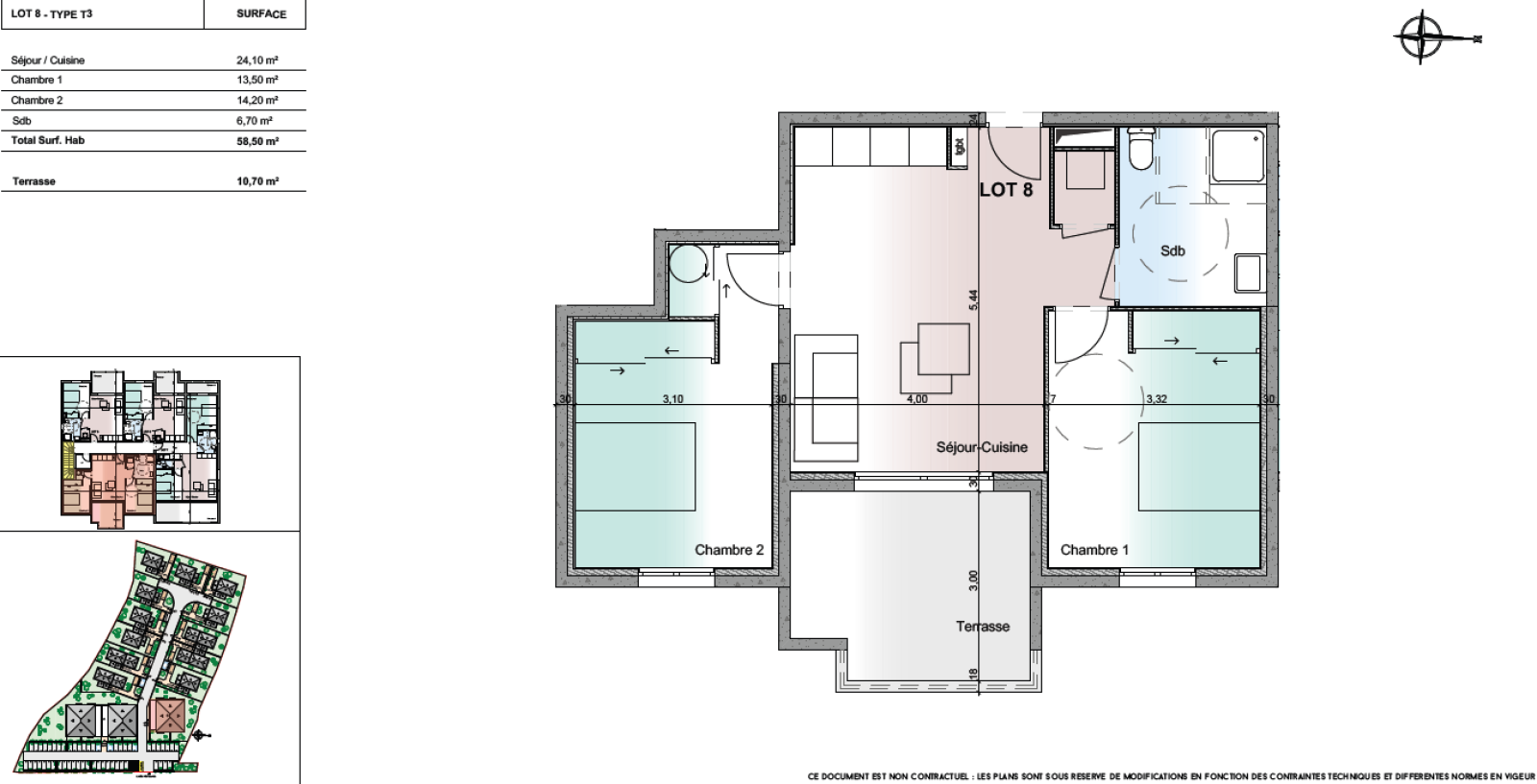 Concernant cet appartement, ce T3 est au 1er étage du bâtiment B, Exposition Est avec une belle terrasse de presque 11m2 ! Les appartements se veulent fonctionnels et pratiques...Pas de perte d'espace ! Vous rentrerez directement sur la pièce principal salon/cuisine ouverte de 24m2, deux grandes chambres de 13,50m2 et 14,20m2 avec emplacement de placard et une salle de bain avec WC de 6,70m2