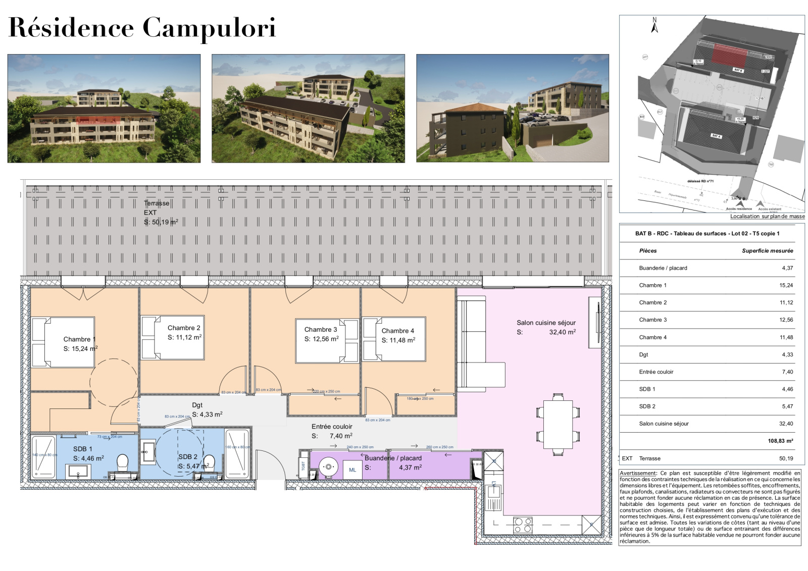 Appartements lumineux T5, avec terrasse DE 50m2 pour profiter pleinement de l’extérieur.
