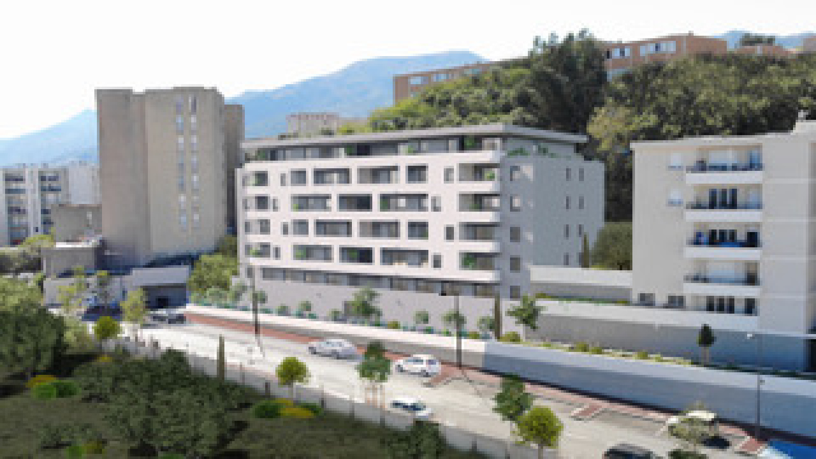 La Résidence est élevée sur 7 niveaux et comprend des surfaces de bureaux et d'habitations: 22 logements de type T2 à T3 variant de 41 à 66m² prolongés par des terrasses couvertes.
