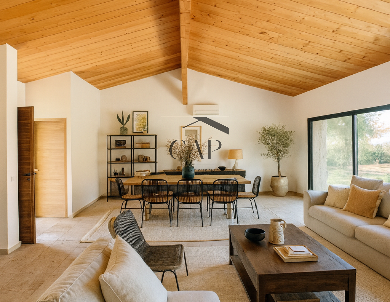 Cette grande villa allie authenticité et modernité avec ses murs extérieurs habillés en pierre et ses menuiseries en aluminium teinté. Elle comprend une grande pièce de vie ouverte avec une cuisine aménagée, deux belles chambres confortables avec salles d’eau privatives et douches à l’italienne et wc suspendu. La toiture en charpente bois et les finitions soignées, comme les plafonds en bois confèrent un charme unique à cette demeure. Ainsi qu'un magnifique extérieur avec piscine privée, terrasse de 60m², cuisine d'été et boulodrome.