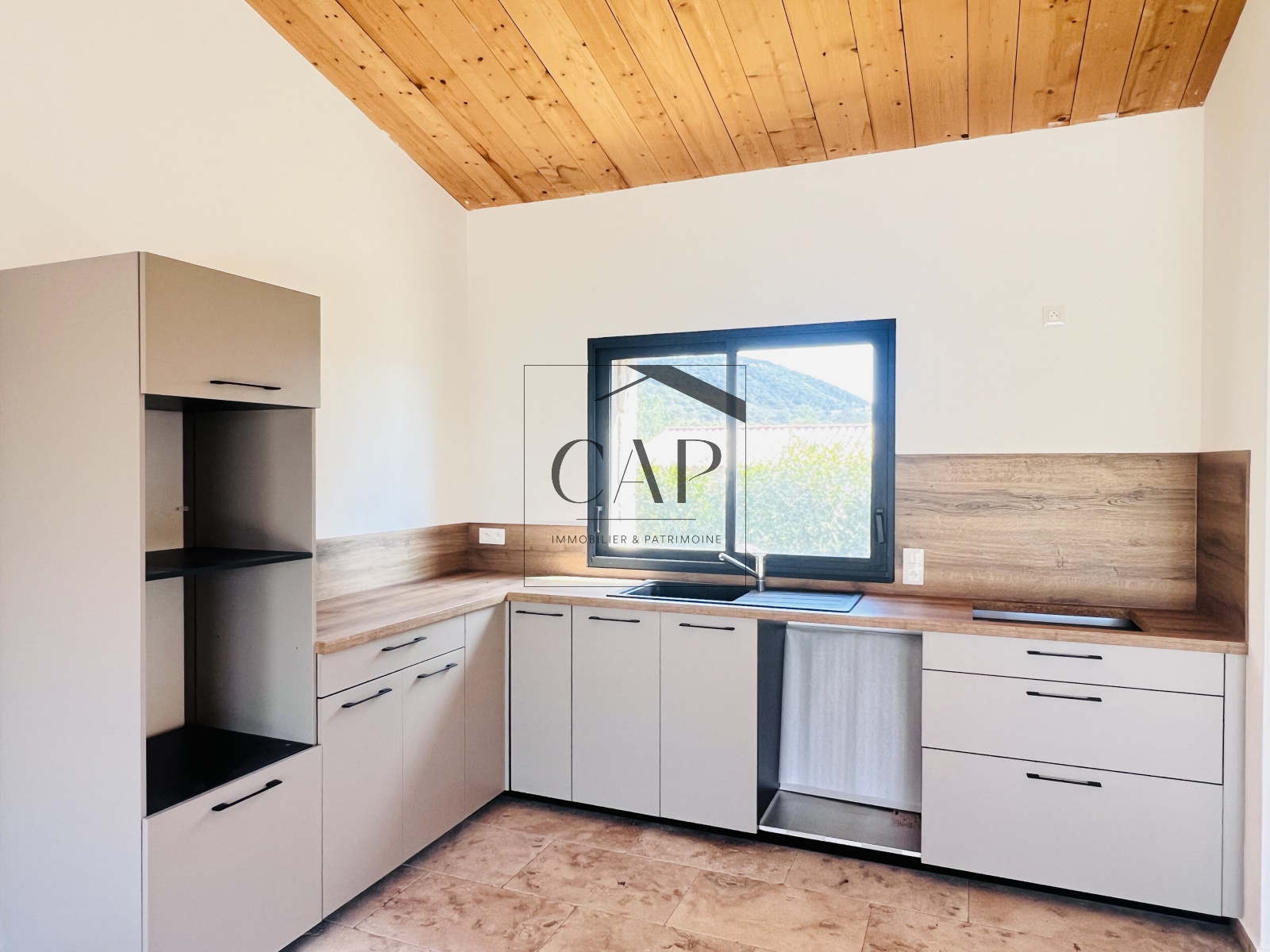 CAP Immobilier & Patrimoine VOUS PROPOSE une superbe villa neuve, individuelle en pierre / bergerie, de plain pied type T3, située dans un cadre idyllique et calme. Spacieuse, d’une surface de 84 m², cette propriété s’étend sur un terrain paysagé de plus de 630m² avec une exposition plein Sud.