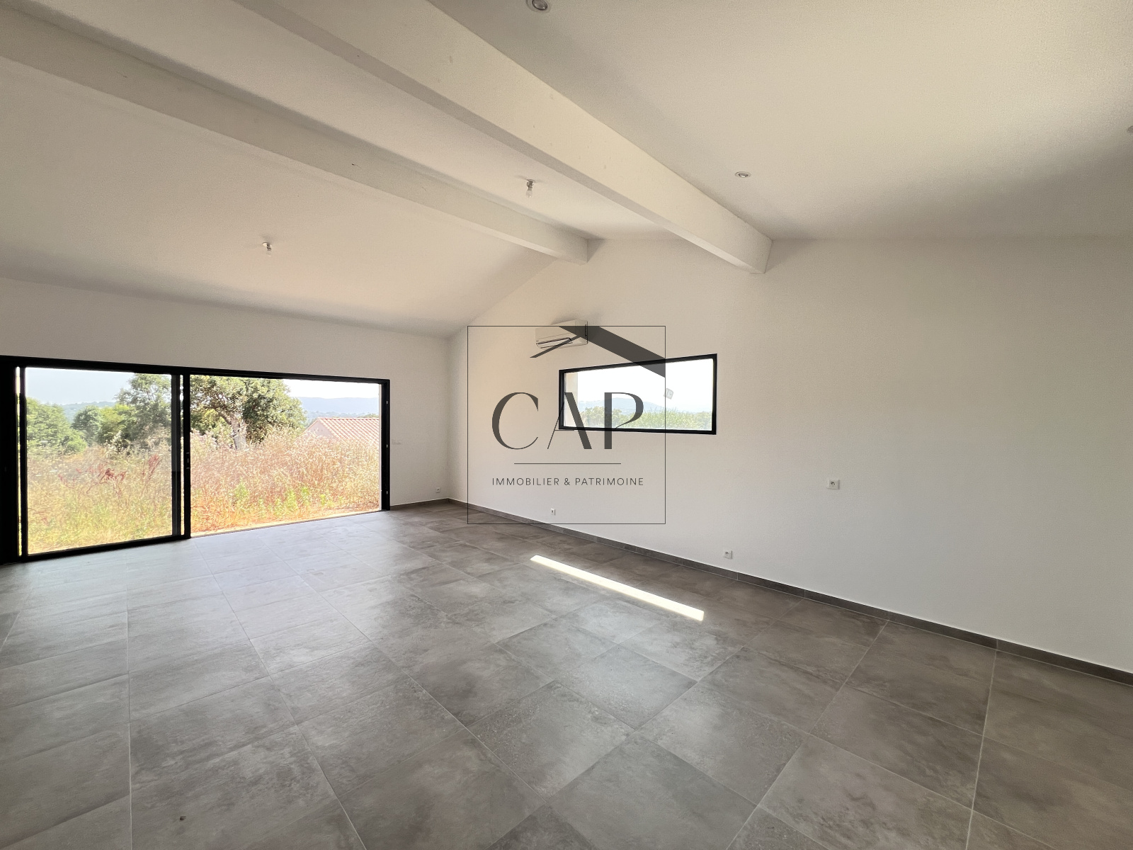 Construction neuve conforme à la RT 2012, menuiseries aluminium double vitrage, carrelage grand format, ballon thermodynamique.