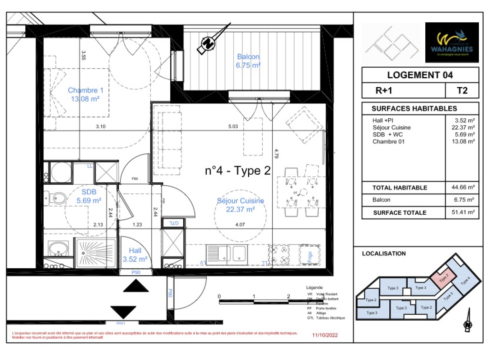 Nous vous proposons, sur la commune de Wahagnies, cet appartement T2 de 44,66m2 environ avec balcon et place de parking privé. Ce bien dispose d'un hall d'entrée avec dressing, d'une pièce de vie, une chambre spacieuse et une salle de douche. Il est situé au second étage d'une copropriété de 18 logements.