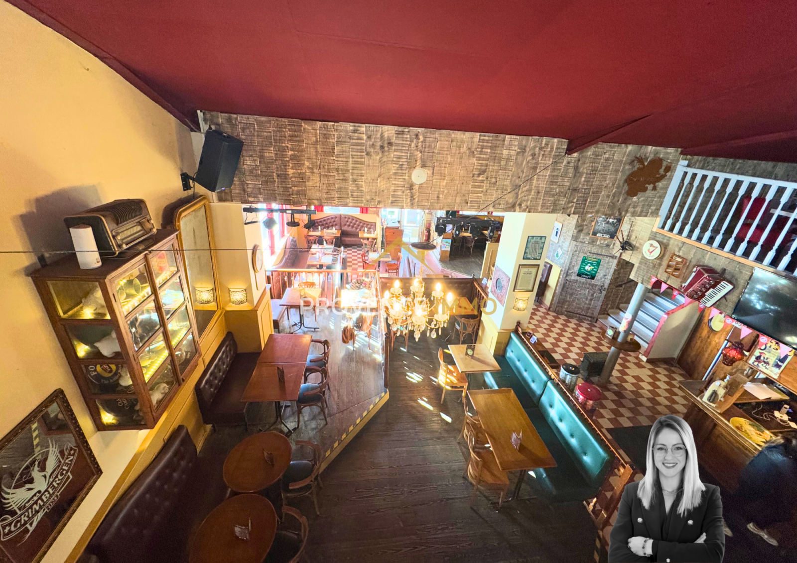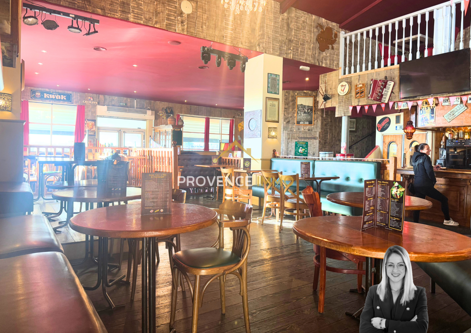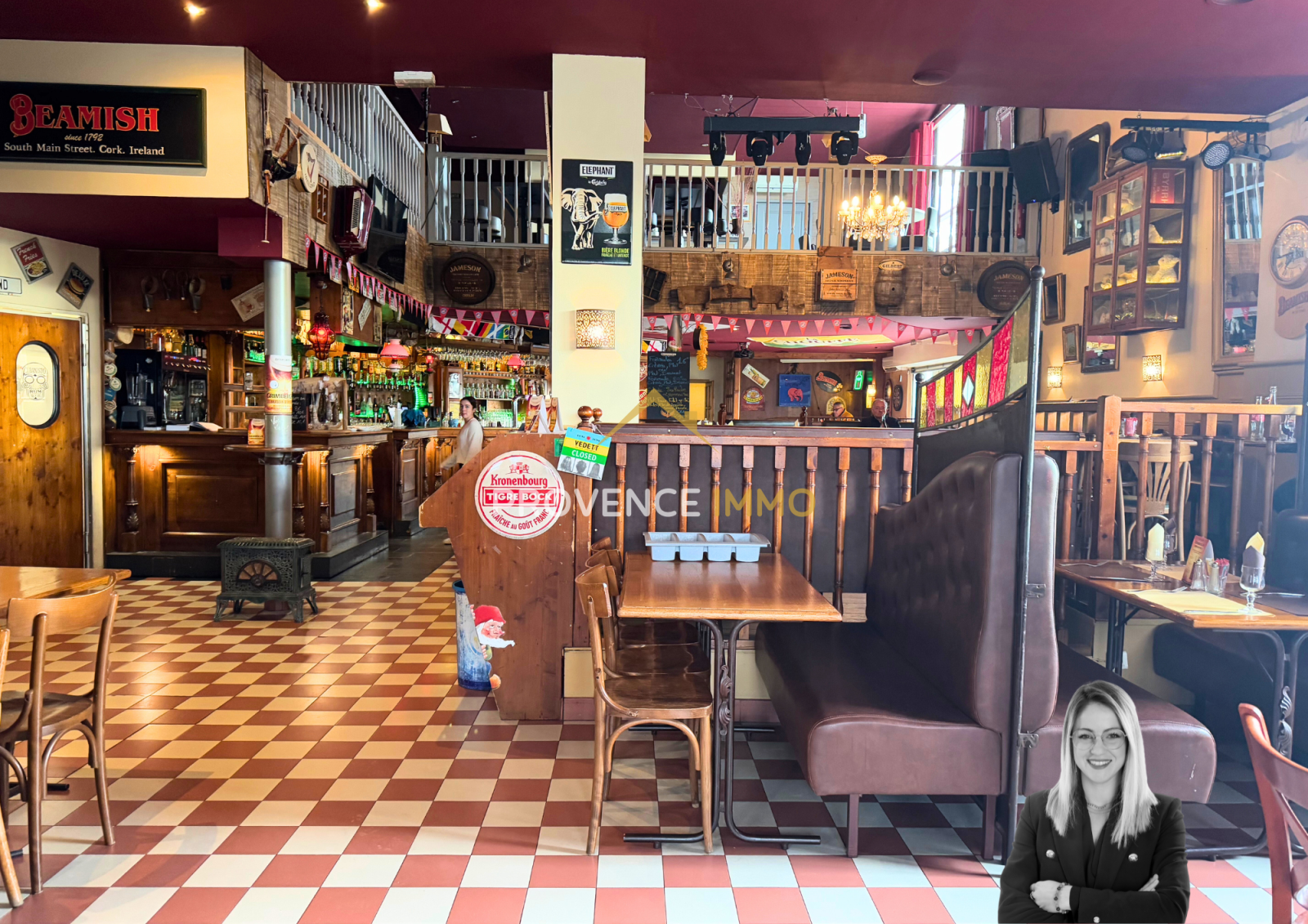 En REZ DE CHAUSSEE vous exploiterez dans une salle dotée de jeux de hauteur créant différents espaces et ambiances chalereuses à la thématique Irlandaise, dont un magnifique comptoir de service de plus de 8m équipé d'une tireuse à 10 becs, enfin les CUISINES et sanitaires pour une superficie totale de près de 300m².