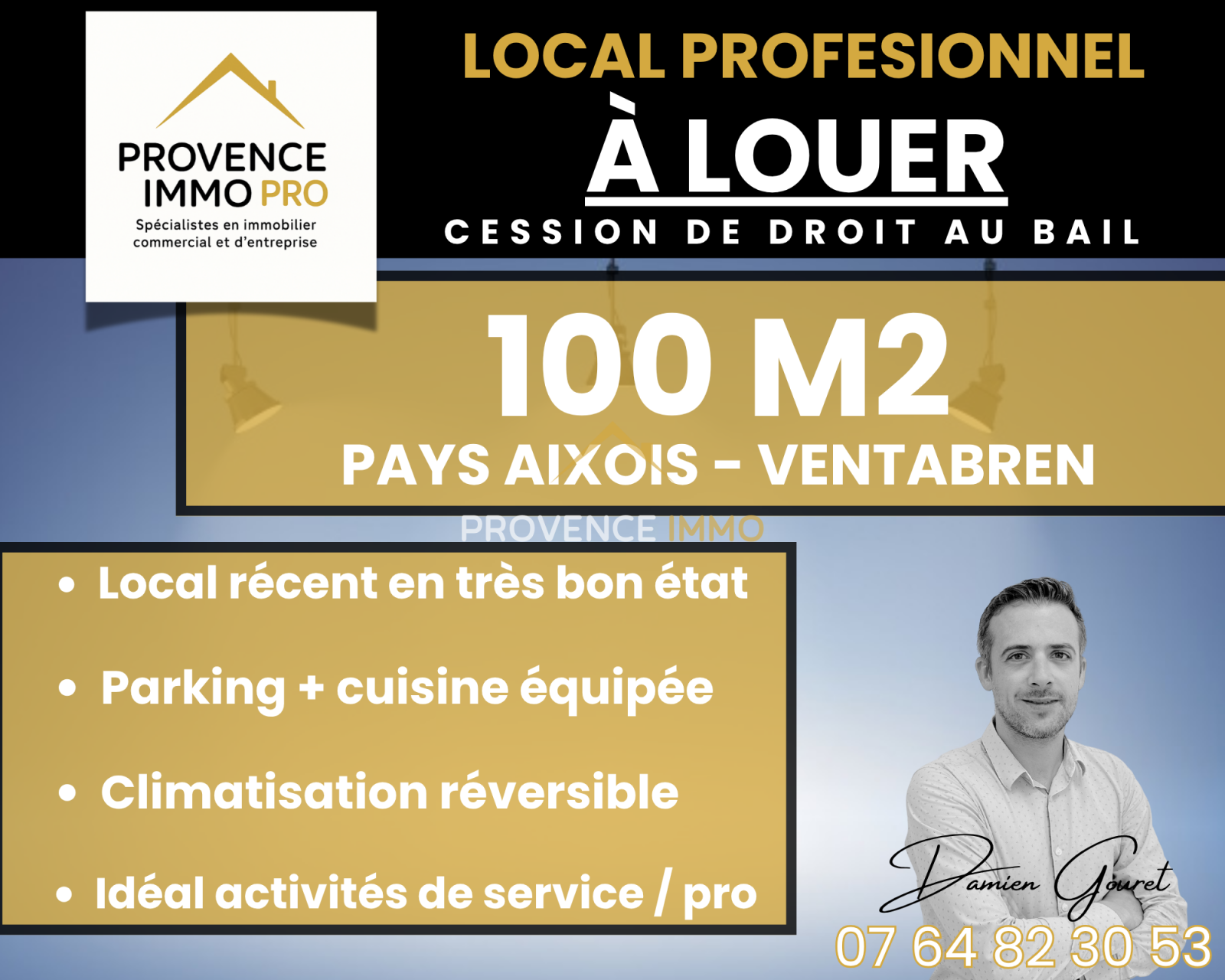 Local équipé : cuisine, climatisation réversible, stationnement partagé (dizaine de places)