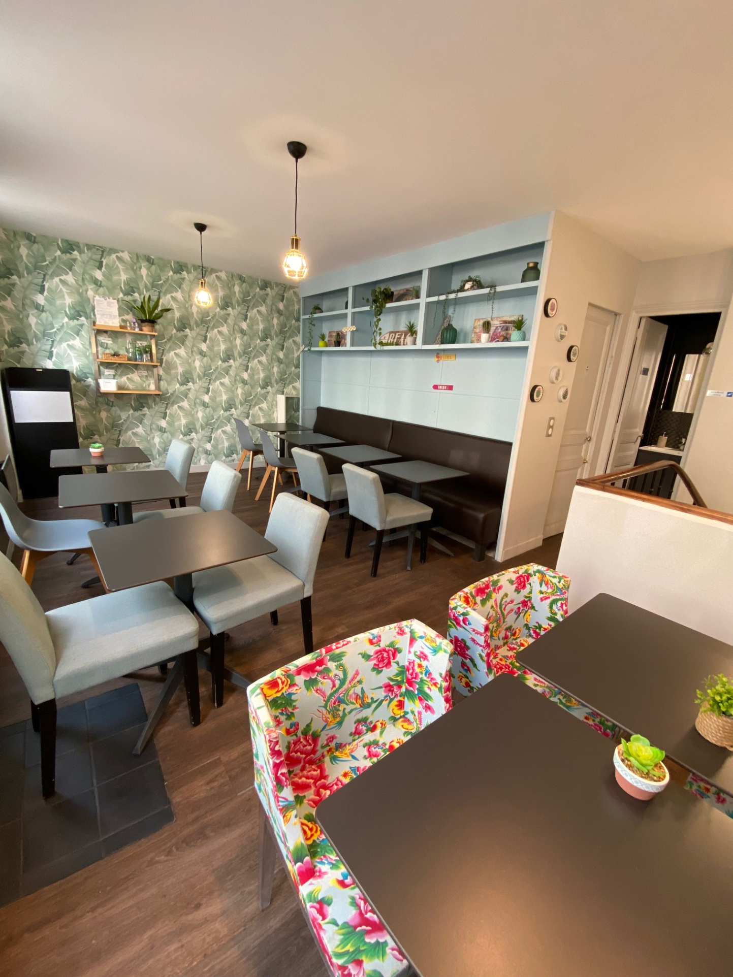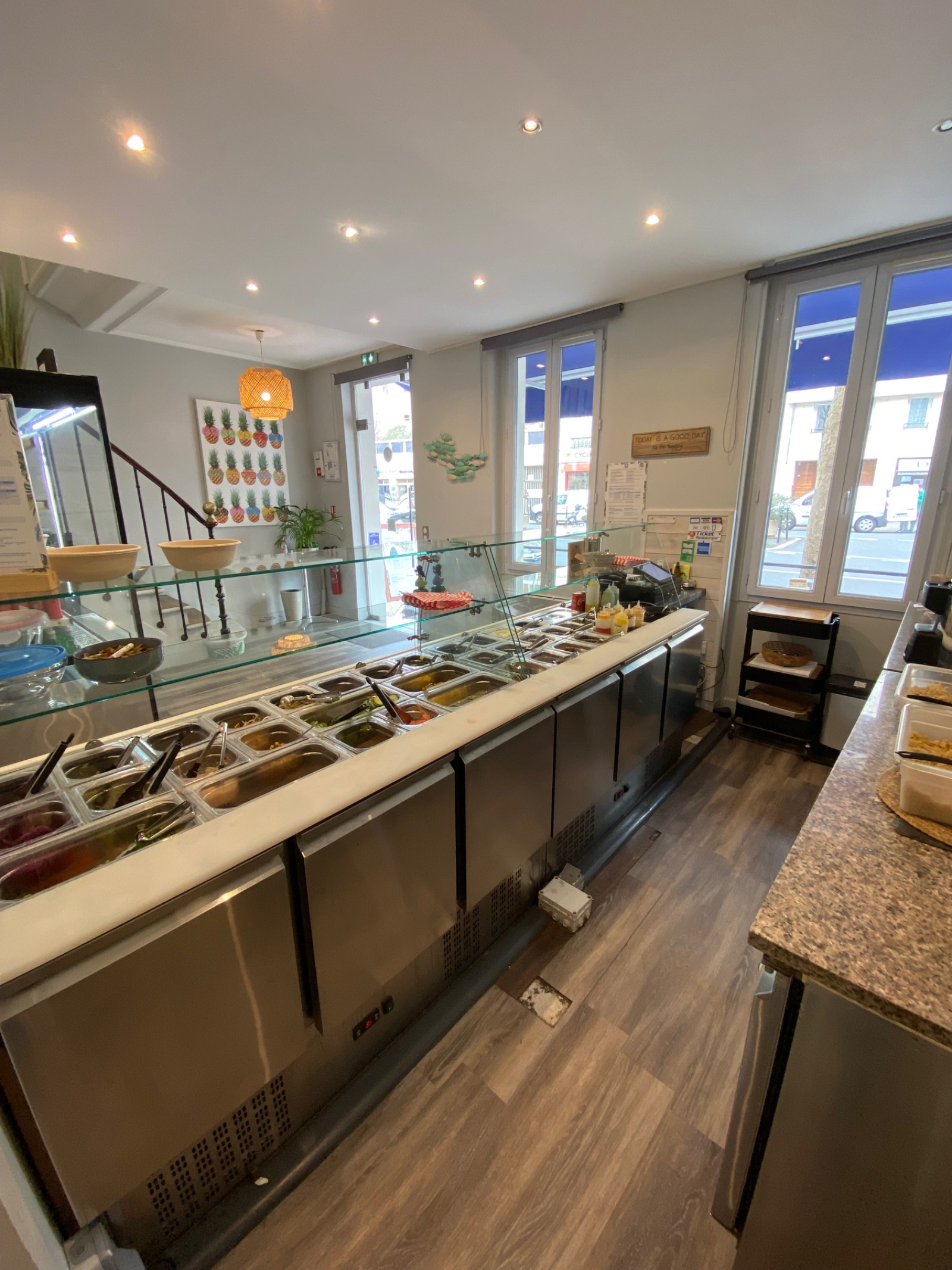 Fonds de restauration rapide - saladerie 93m2 sur 2 niveaux ( dont 45 m2 au RdC) offrant une capacité de 28 couverts en salle associée à 12 en terrasse ainsi qu'une surface de stockage en sous-sol et espace bureau à l'étage.