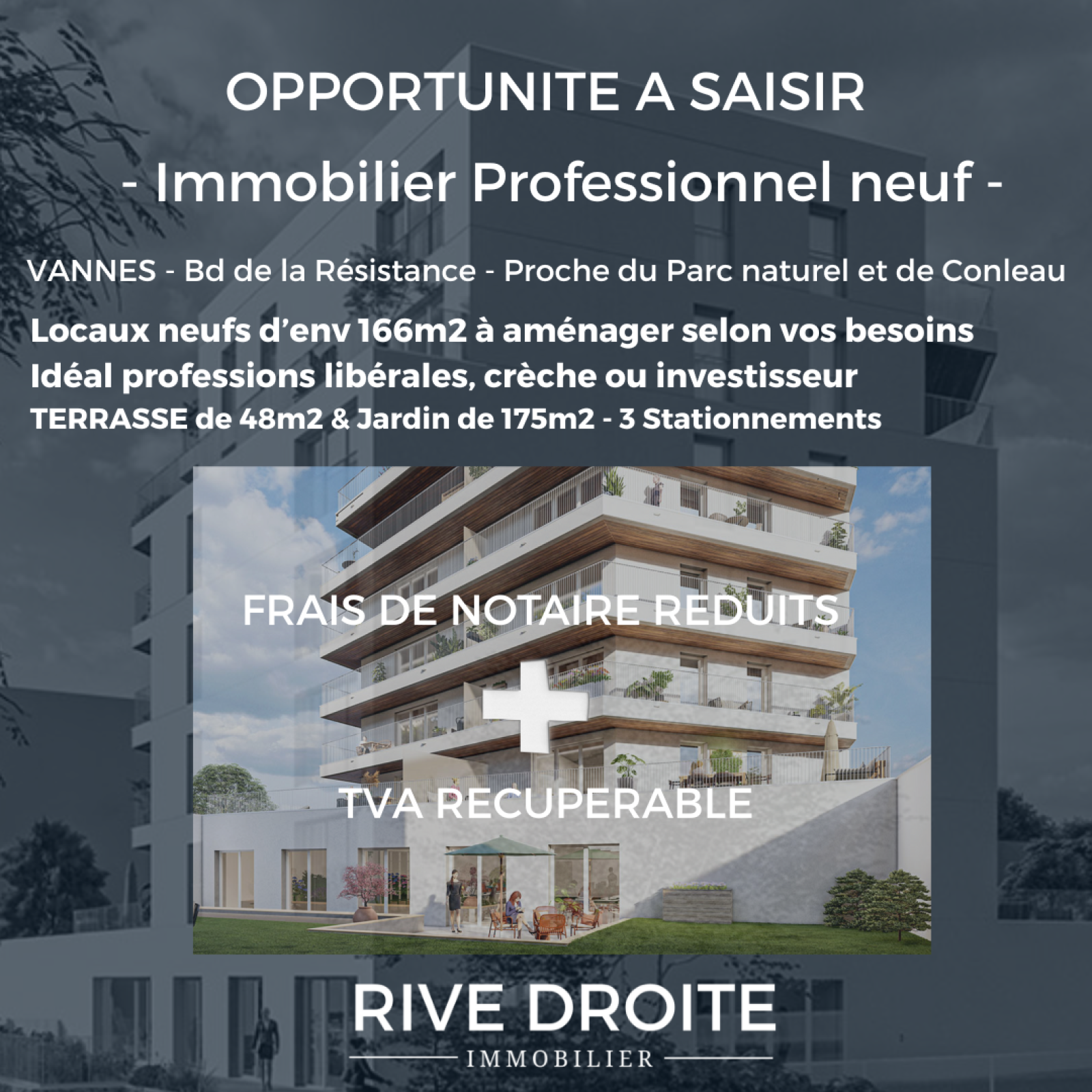 RIVE DROITE Vous propose :VANNES - Bd de la Résistance - Entre le Parc et Conleau - BELLE OPPORTUNITE pour INVESTISSEUR / PROFESSION LIBERALE / CRECHES souhaitant s'installer dans des locaux neufs aux normes modernes, idéalement situés.