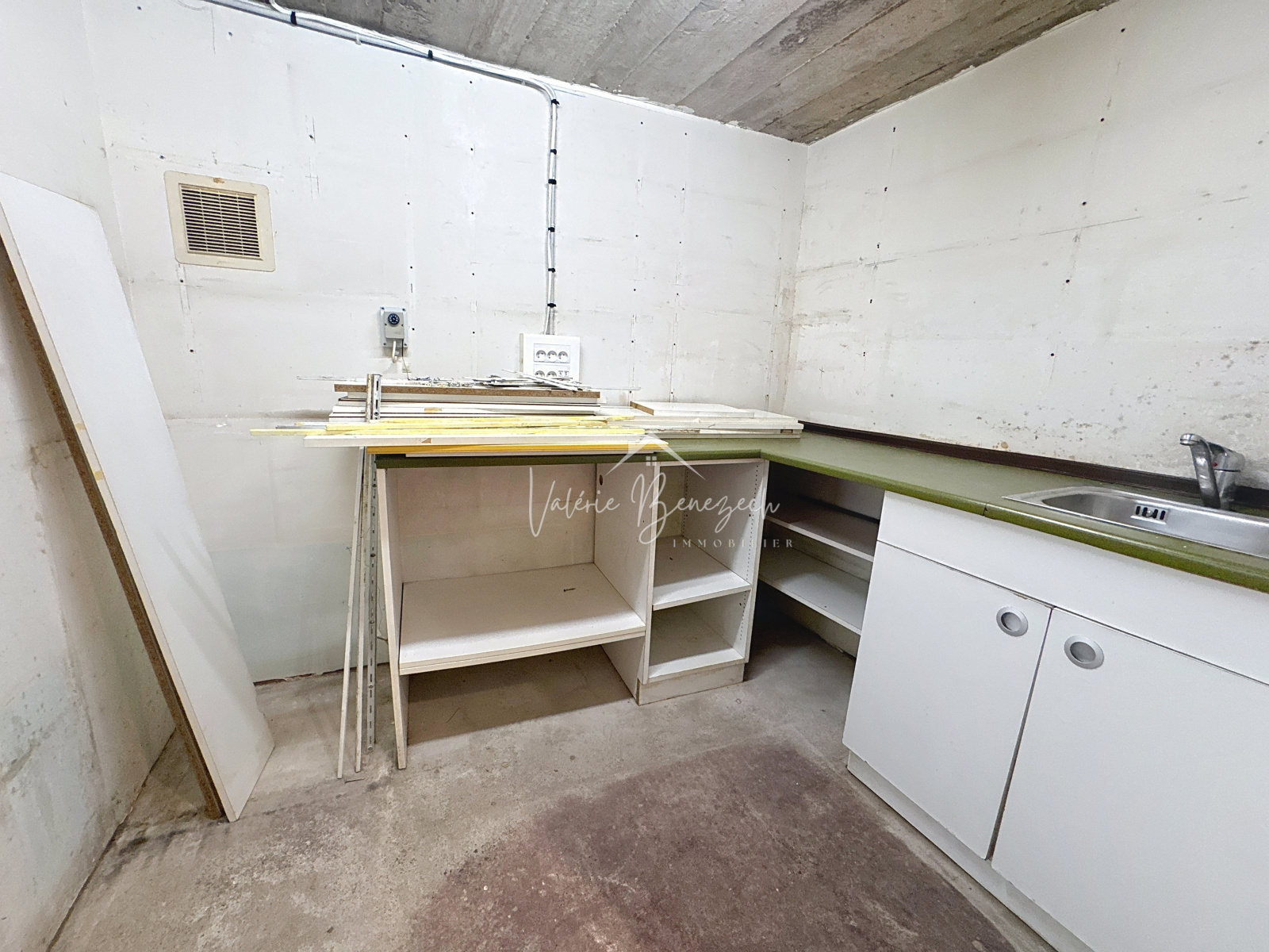 Dalle, évier et placards