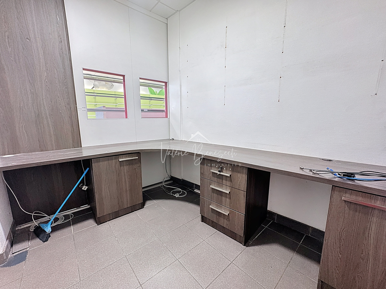 Carrelage, bureau, tiroirs et étagères