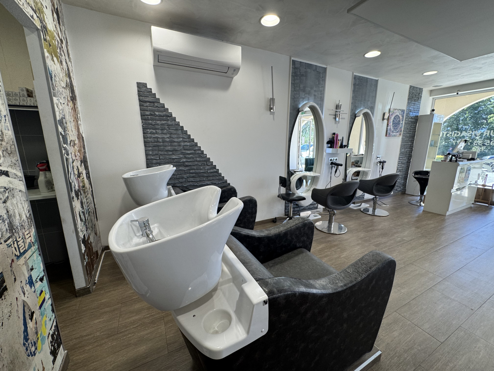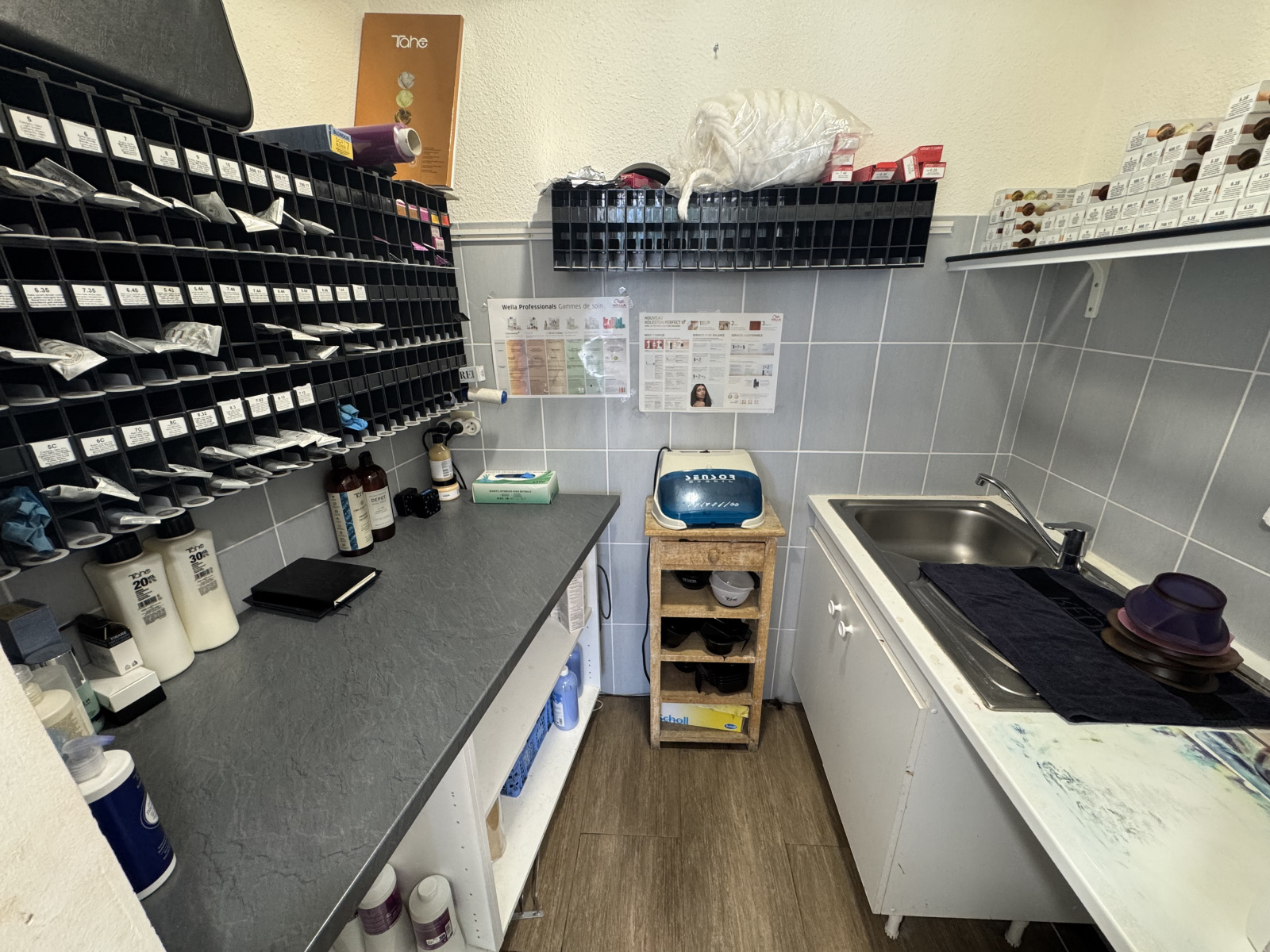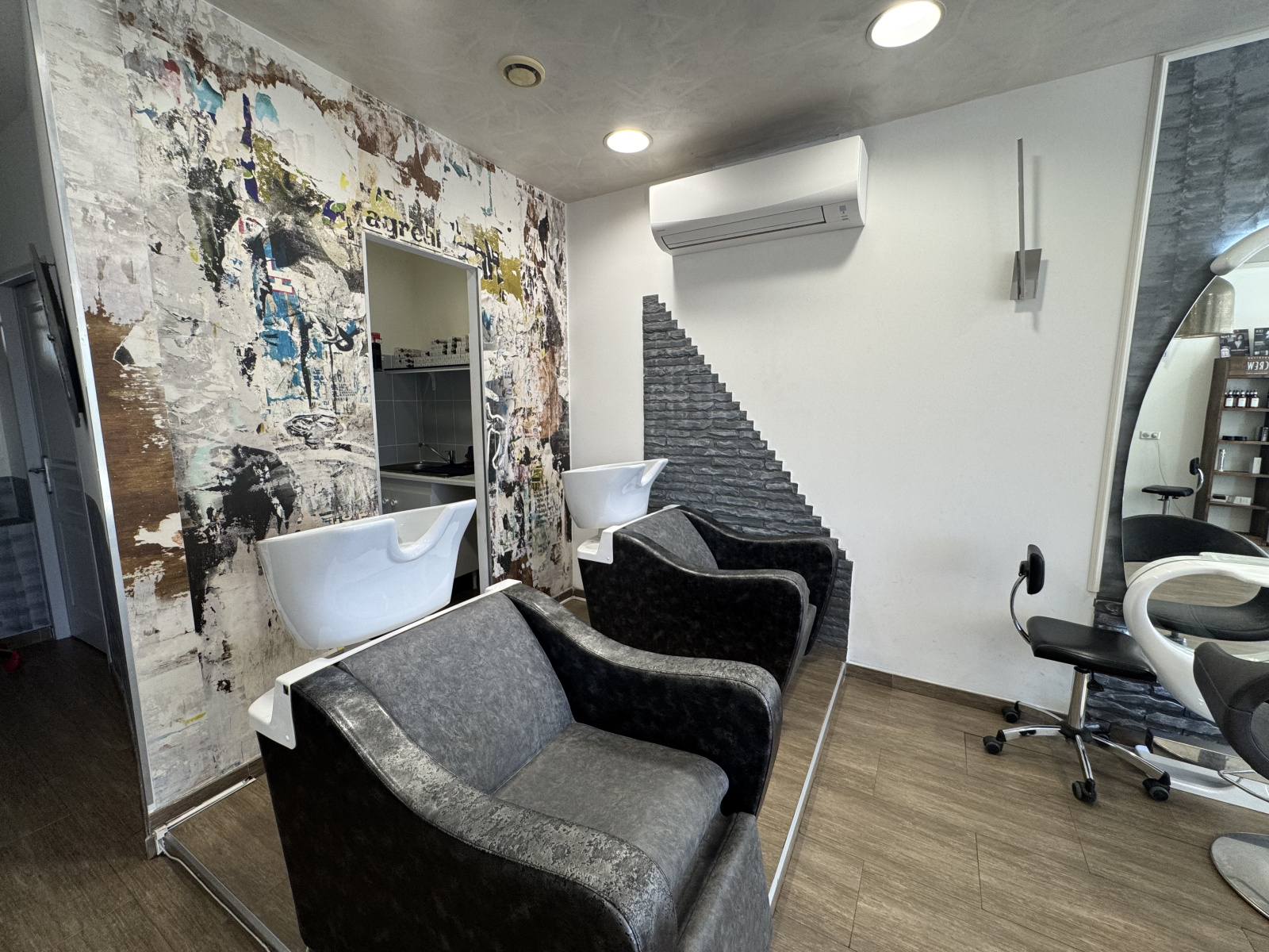 Il se comppose d'une pièce principale de 36m2 avec coin accueil/attente, 4 postes de coiffures, 3 bacs à shampoing avec fauteuils électriques allongés et massants, une première réserve est situé à l'arrirère.
